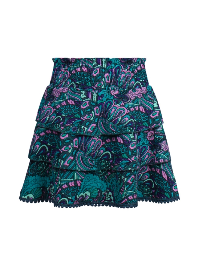 Strokenrok met een retro print. Voorzien van een comfortabele elastische smock tailleband. De onderste strook is verfraaid met een decoratieve sierband met stippeltjes. Een trendy en veelzijdige aanvulling op je garderobe voor een modieuze en speelse look!