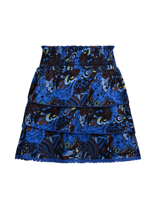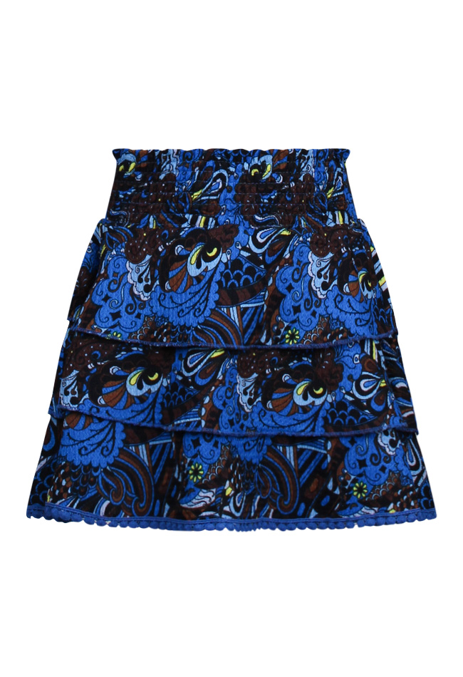 Strokenrok met een retro print. Voorzien van een comfortabele elastische smock tailleband. De onderste strook is verfraaid met een decoratieve sierband met stippeltjes. Een trendy en veelzijdige aanvulling op je garderobe voor een modieuze en speelse look!
