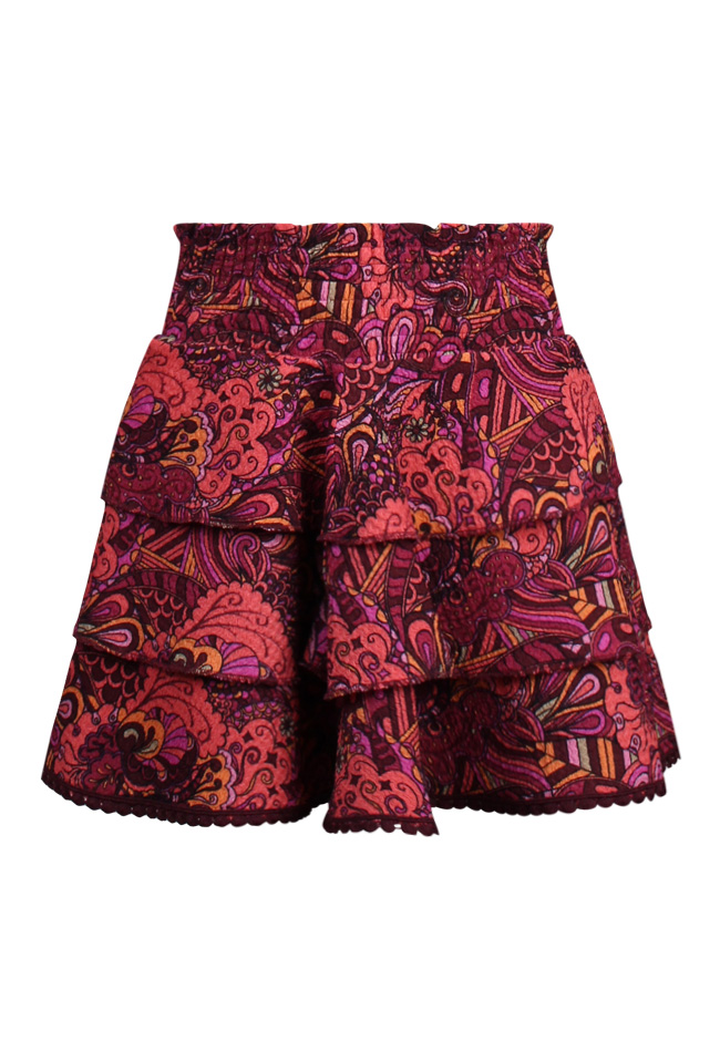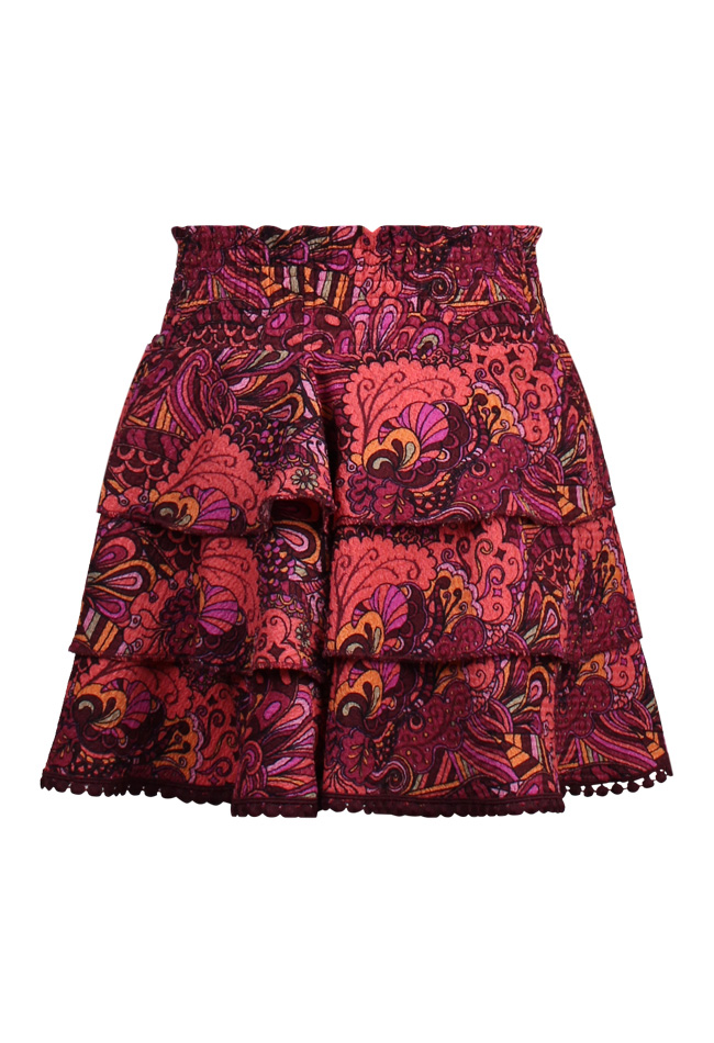Strokenrok met een retro print. Voorzien van een comfortabele elastische smock tailleband. De onderste strook is verfraaid met een decoratieve sierband met stippeltjes. Een trendy en veelzijdige aanvulling op je garderobe voor een modieuze en speelse look!