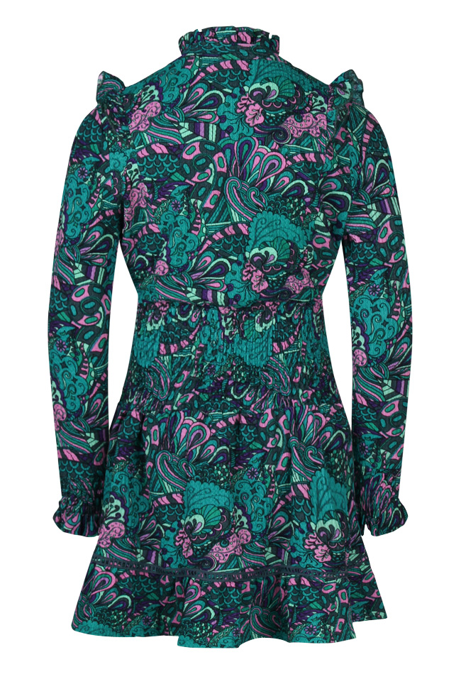 Vrolijke meisjes jurk in retrodesign. Deze jurk heeft een elastiek in de tailleband en in de mouwen. Met een ronde hals en op de kraag bevinden zich ruches net als over de schouder. Tot de taille zitten er knoopjes op.