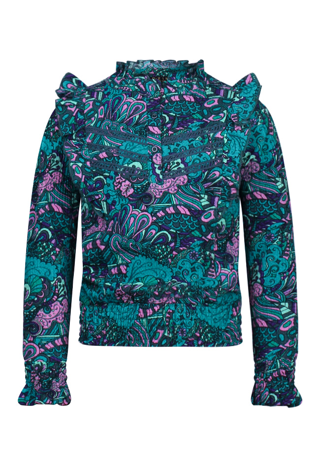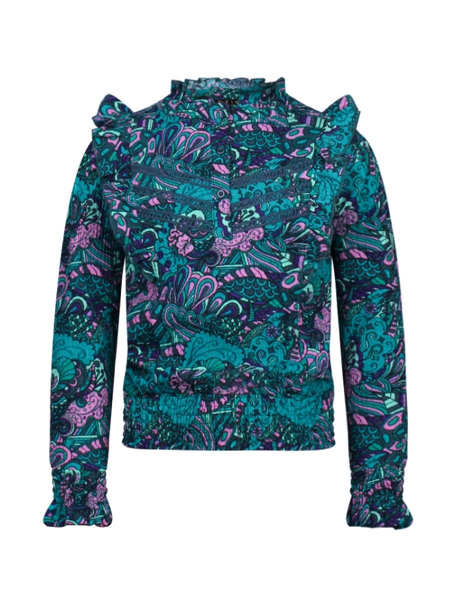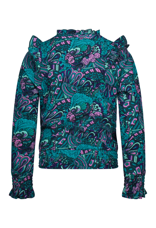 Meisjes blouse met retro design. Deze blouse heeft een elastische boord onderaan de mouwen en taille. Rond de ronde hals zit ruche, net als op de schouder.
