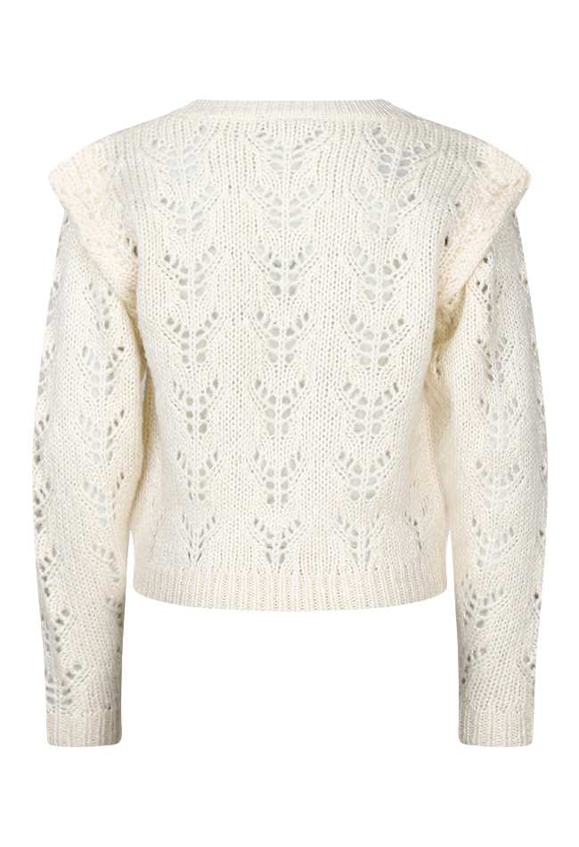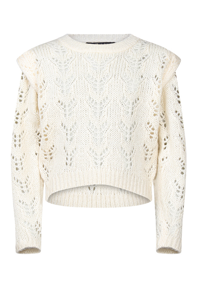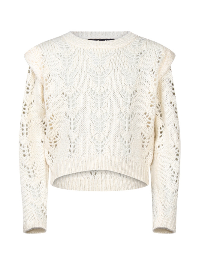 Meisjes trui van ajourbreisel. Hierdoor is hij iets doorschijnend. Het is een wat korter model en heeft een grappig kapmouwtje.