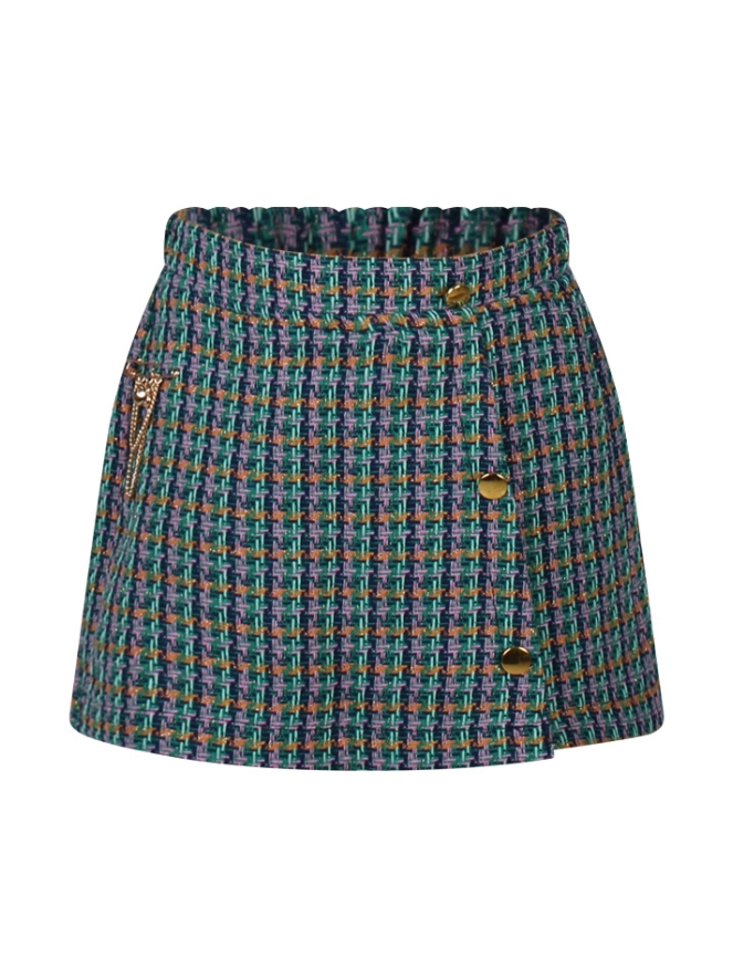 Geruit broek rokje gemaakt van tweed stof. De voorkant heeft een overslag waardoor dit broekje net lijkt op een rokje. Op het voorpand zitten twee 3 gouden sierknopen en een stoere speld met kettingen. De tailleband is voorzien van een elastiek aa de achterkant voor een goede pasvorm.