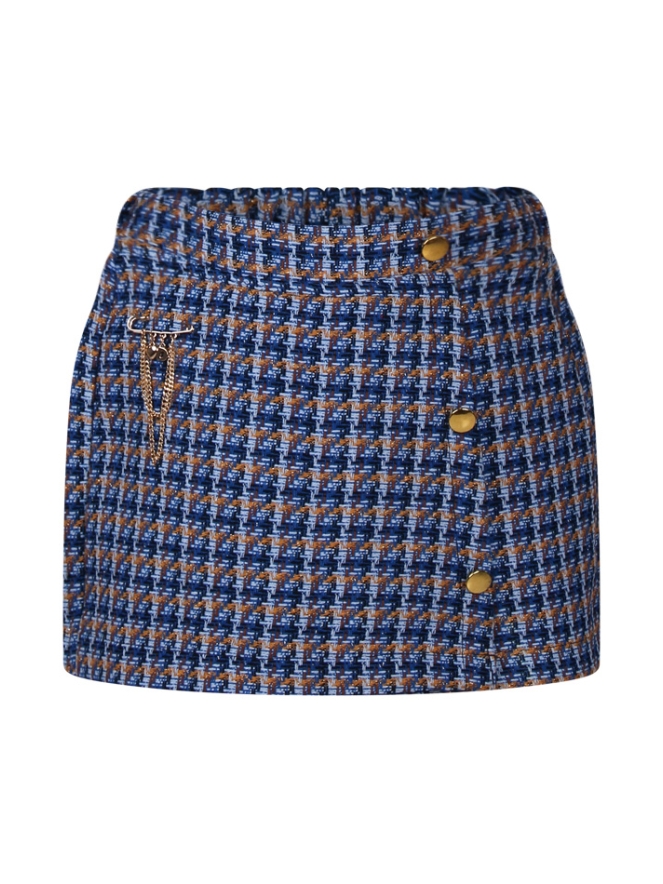 Geruit broek rokje gemaakt van tweed stof. De voorkant heeft een overslag waardoor dit broekje net lijkt op een rokje. Op het voorpand zitten twee 3 gouden sierknopen en een stoere speld met kettingen. De tailleband is voorzien van een elastiek aa de achterkant voor een goede pasvorm.