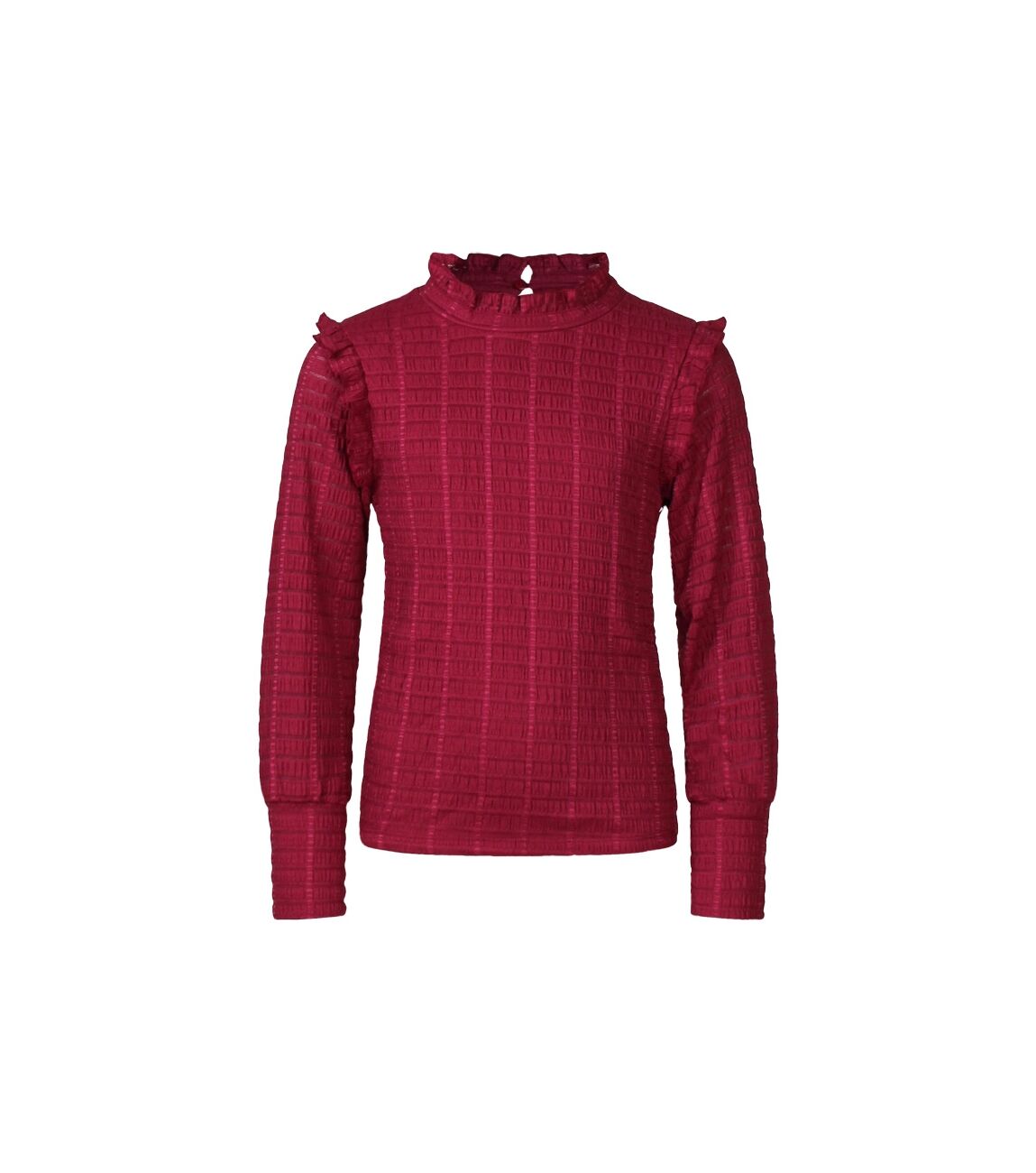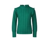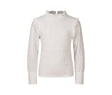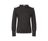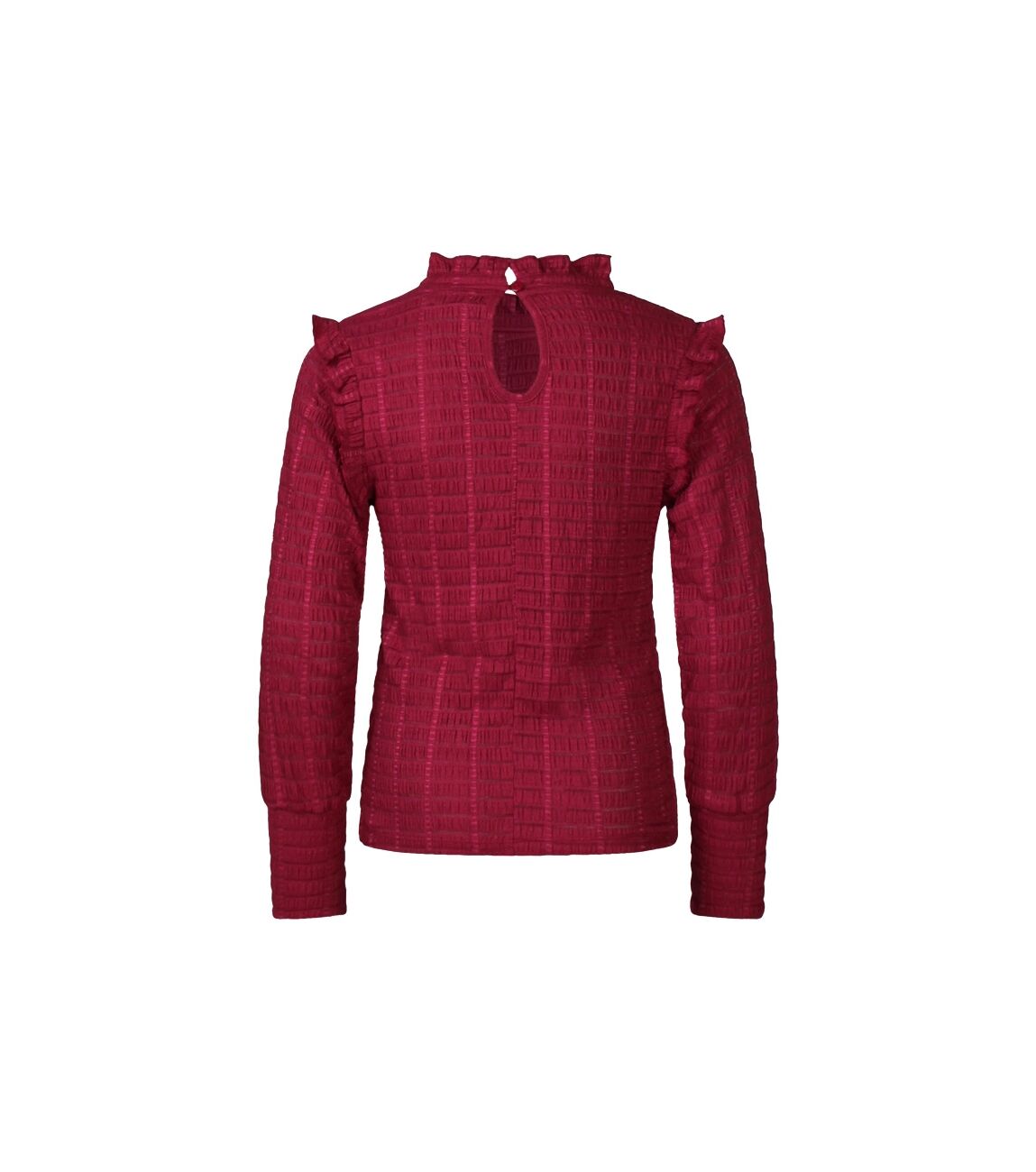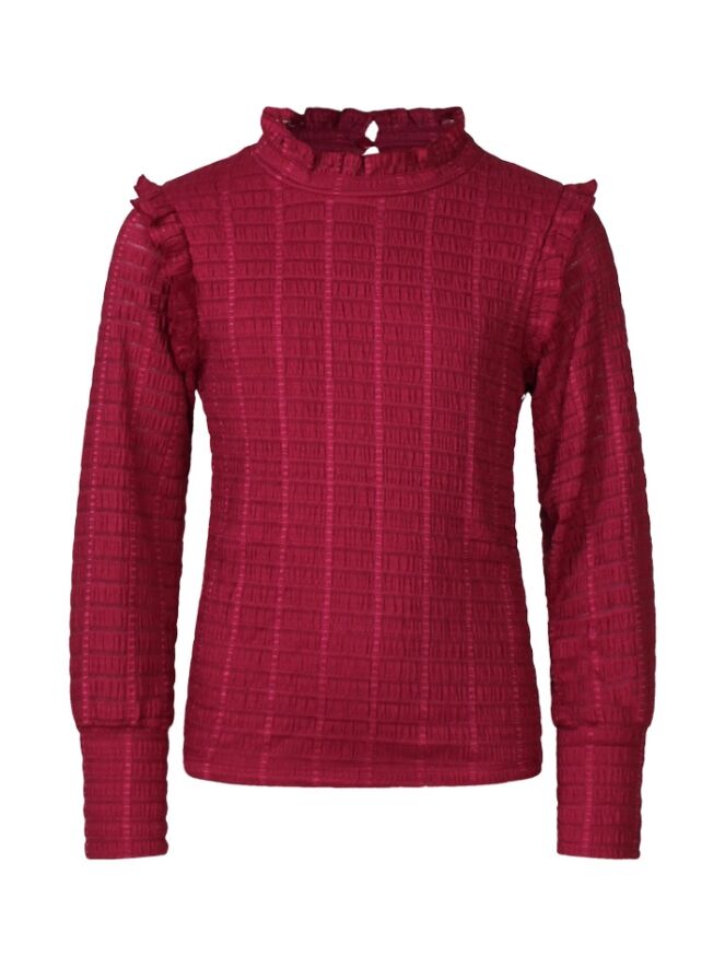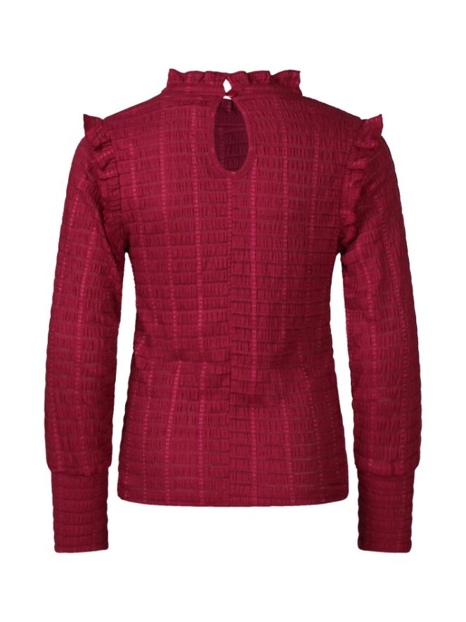 Top gemaakt van een fancy breisel met een ronde opstaande hals met ruche randje, ruches over de schouderkop en hoge aangesloten smock-manchetten. De achterkant wordt gesloten met een knoopje en heeft een ronde opening als detail op de rug.
