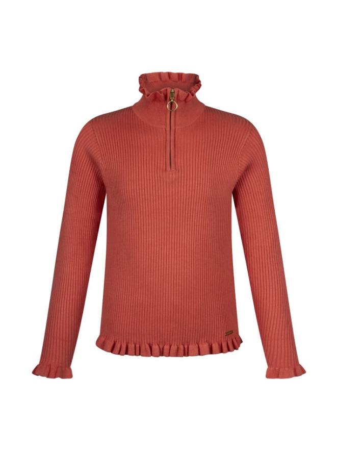 Meisjes trui. Pullover model met ruche onder, aan de mouwen en hals. De rits is goudkleurig.