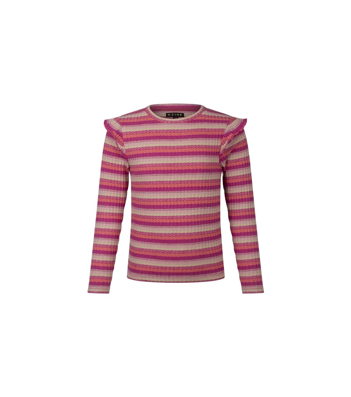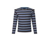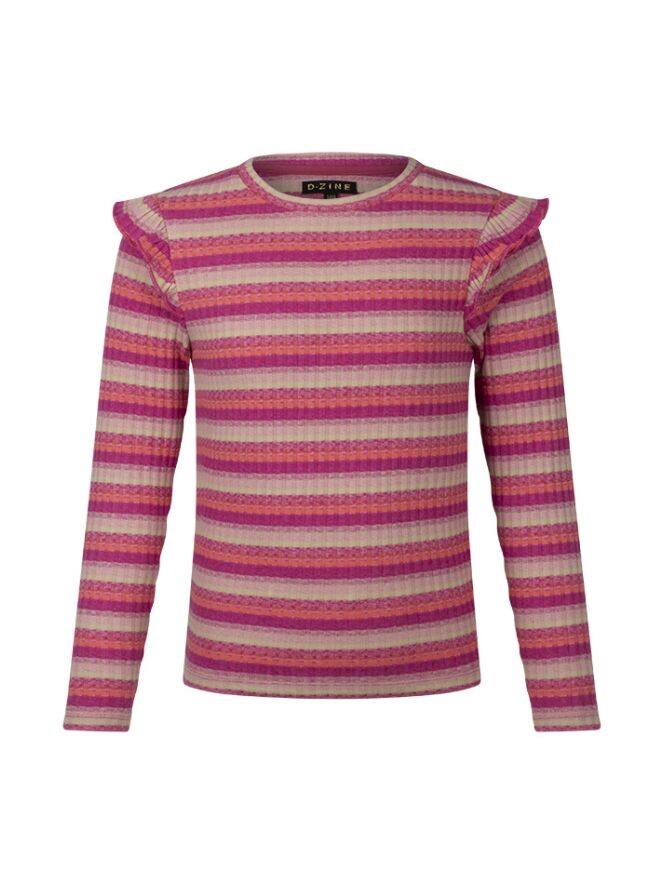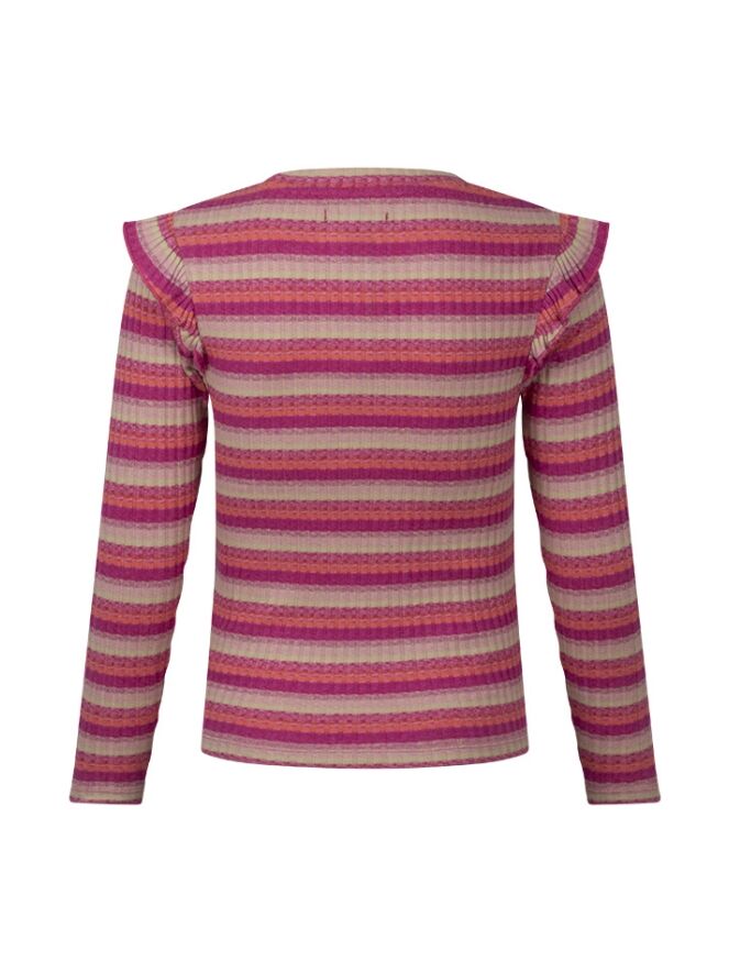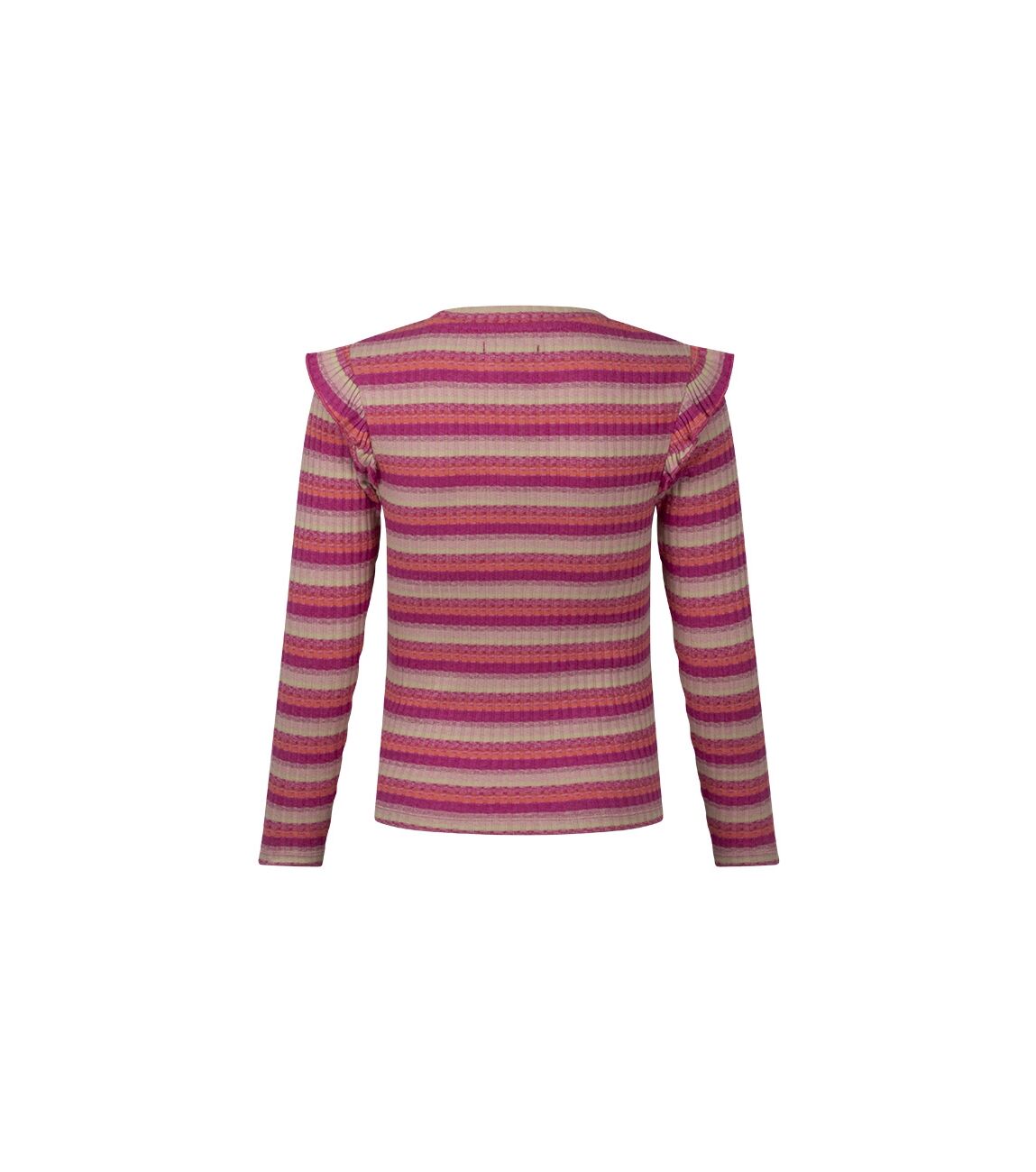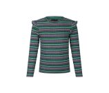 Meisjes shirt met lange mouwen en een ronde hals. Dit shirt heeft ruches op de schouders en een streekpatroon met kleuren.