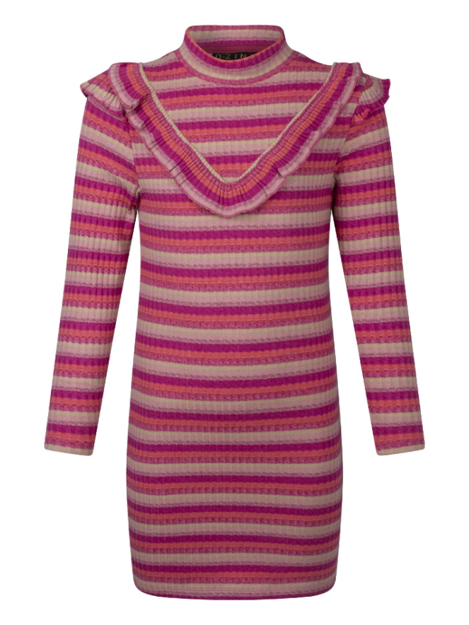 Gestreepte meisjes jurk. Deze jurk is gestreept en is lekker stretchy. Op de voorkant een grote ruche in V vorm.