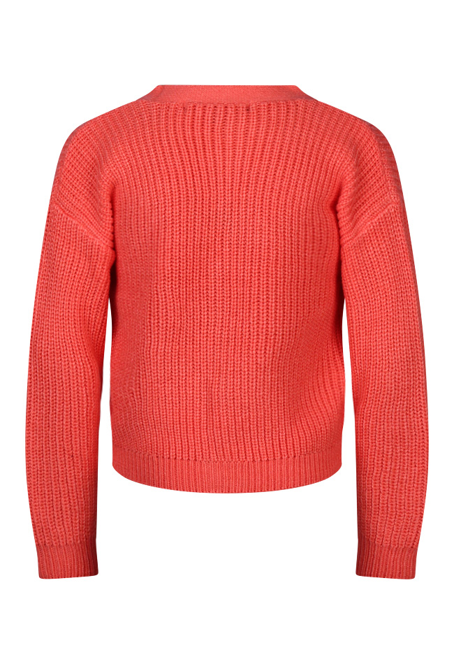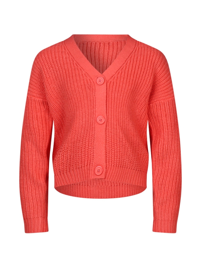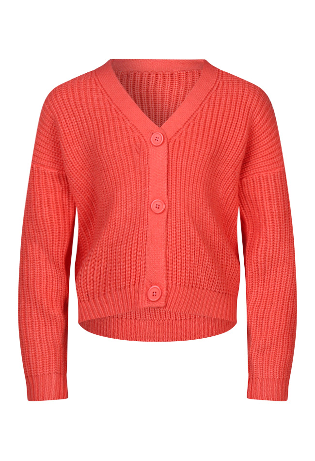 Meisjes vest met V hals en drie knopen. Dit vest heeft een grof ribbreisel en is verkrijgbaar in vijf kleuren.