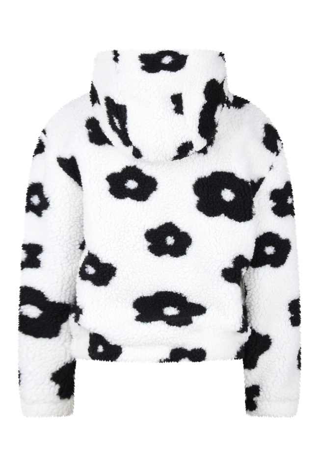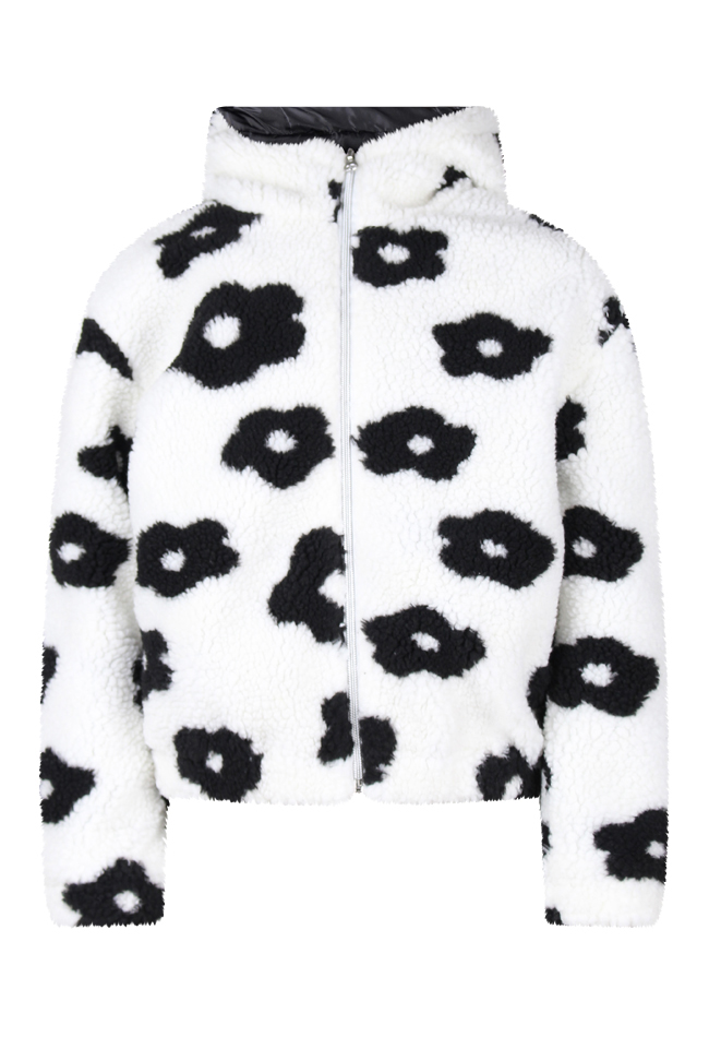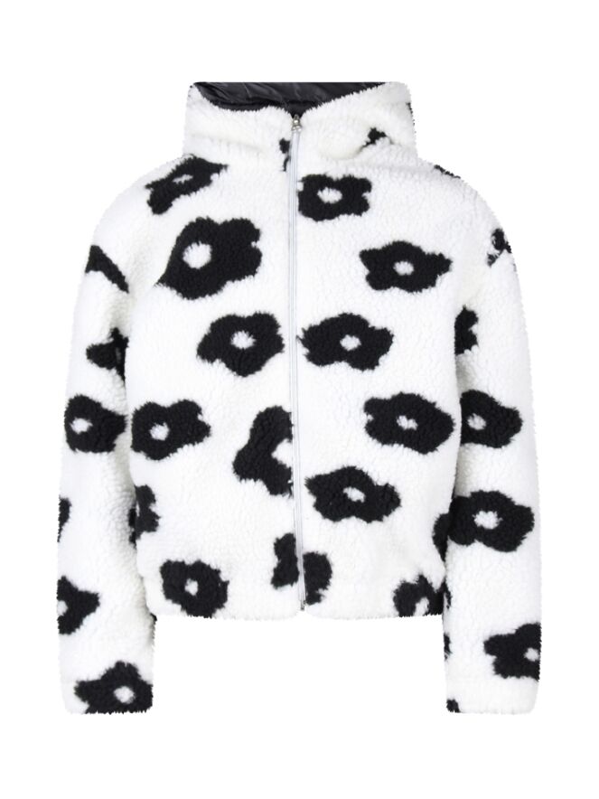 Teddy bomberjack met bloemenprint en capuchon. Sluit aan de voorkant met een rits. Brede elastische boorden houden de jas goed aangesloten en houden de kou buiten. Stijlvol en comfortabel.