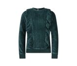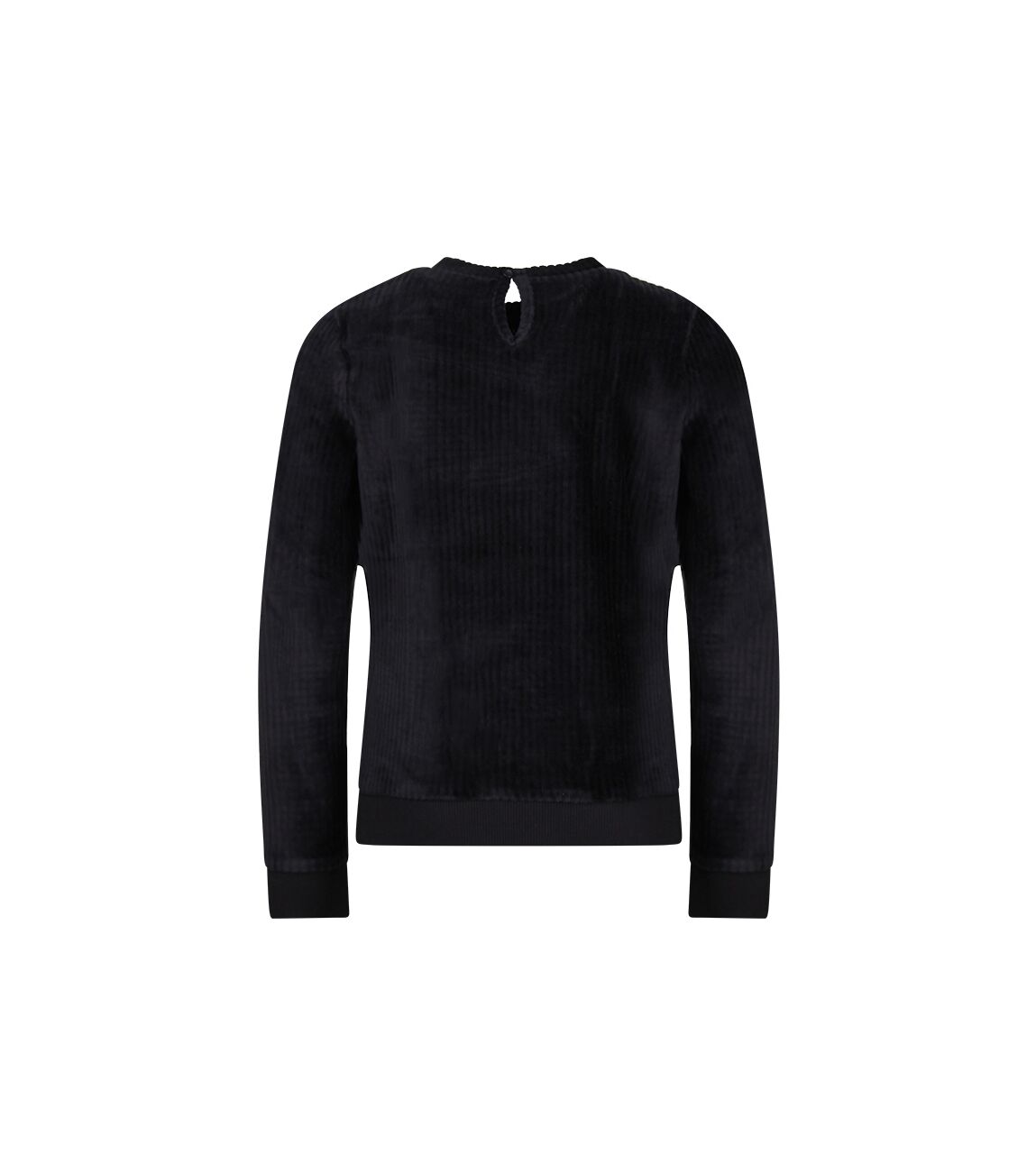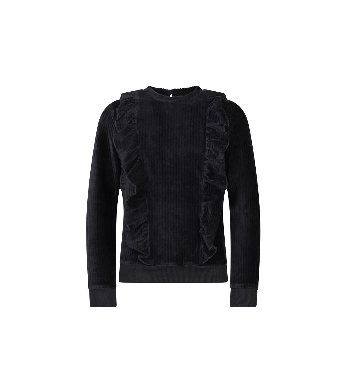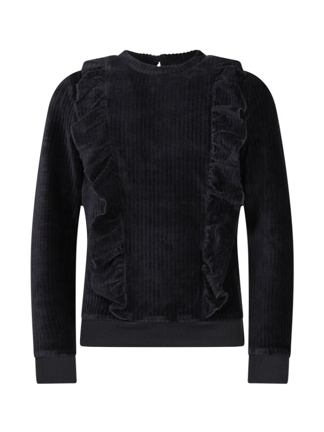 Stijlvol sweater model gemaakt van elastisch rib velours stof. Aan de voorzijde zijn leuke, hippe verticale roezels aangebracht. De sweater heeft een tricot boord aan de onderzijde voor een comfortabele en trendy pasvorm.