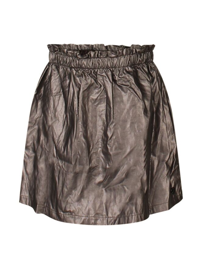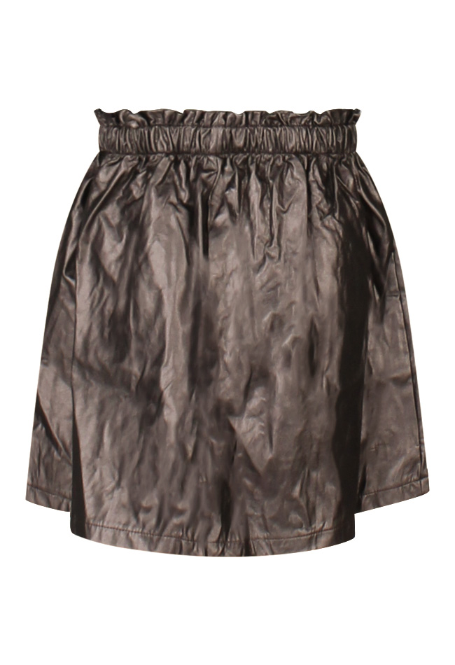 Deze blikvanger met metalic look is van nep leer. Dit rokje is een paperbag model en heeft elastiek in de tailleband. Super leuk te combineren met een stoere sweater of een leuk shirt!