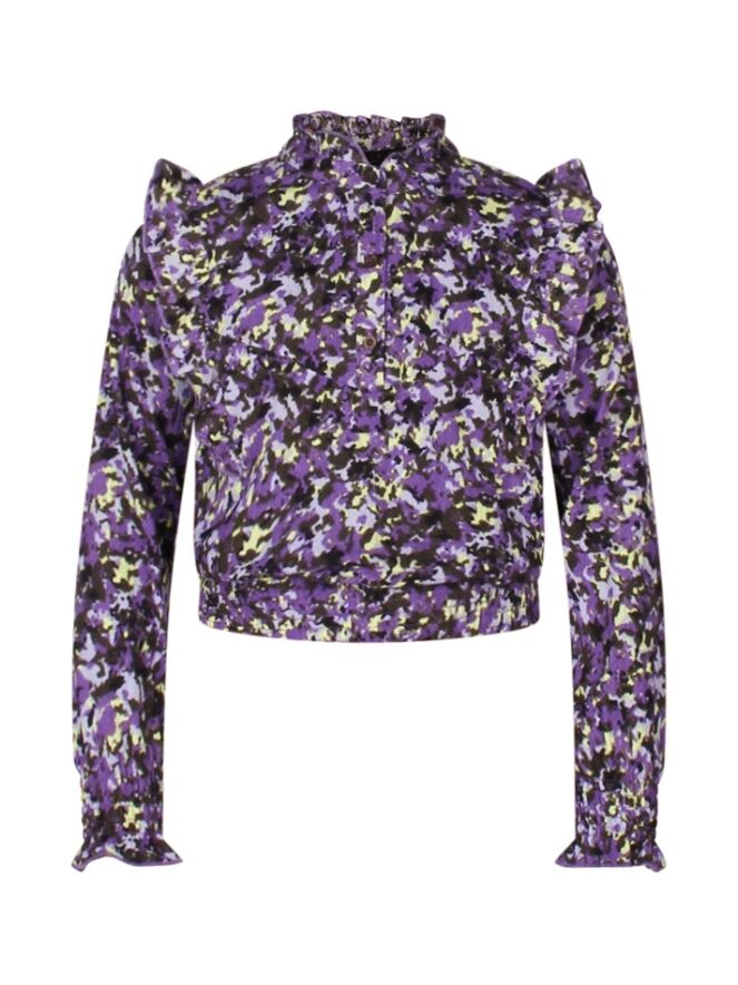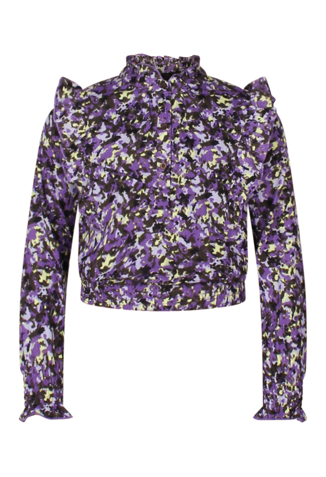 Vrolijke top van D-Zine met kleurrijk confetti design. In de taille en aan het uiteinde van de mouwen zit een elastische smockband met over de schouder een ruche. Leuk en makkelijk te combineren op jeans, korte broek of een leuk effen rokje.