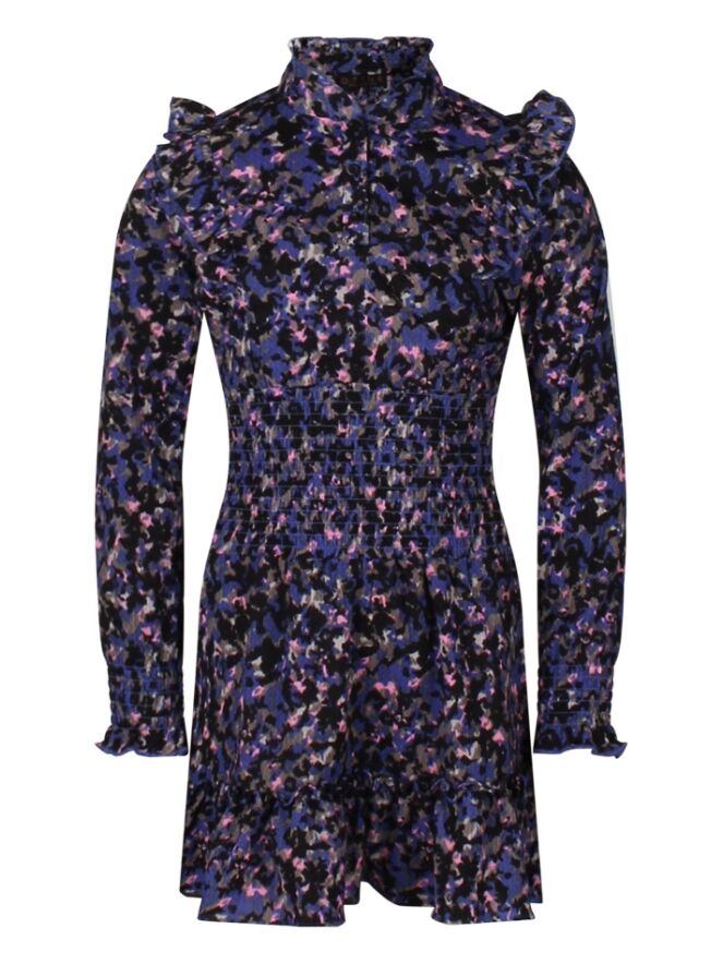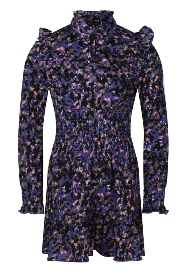 Dit vrolijke meerkleurige jurkje heeft naast zijn vrolijke patroon ook leuke details. In de taille zit een brede elastische smockband, ook zit dit aan het uiteinde van de mouw. Draag het op koudere dagen met een legging eronder en stoere boots maar kan ook prima nu gedragen worden!