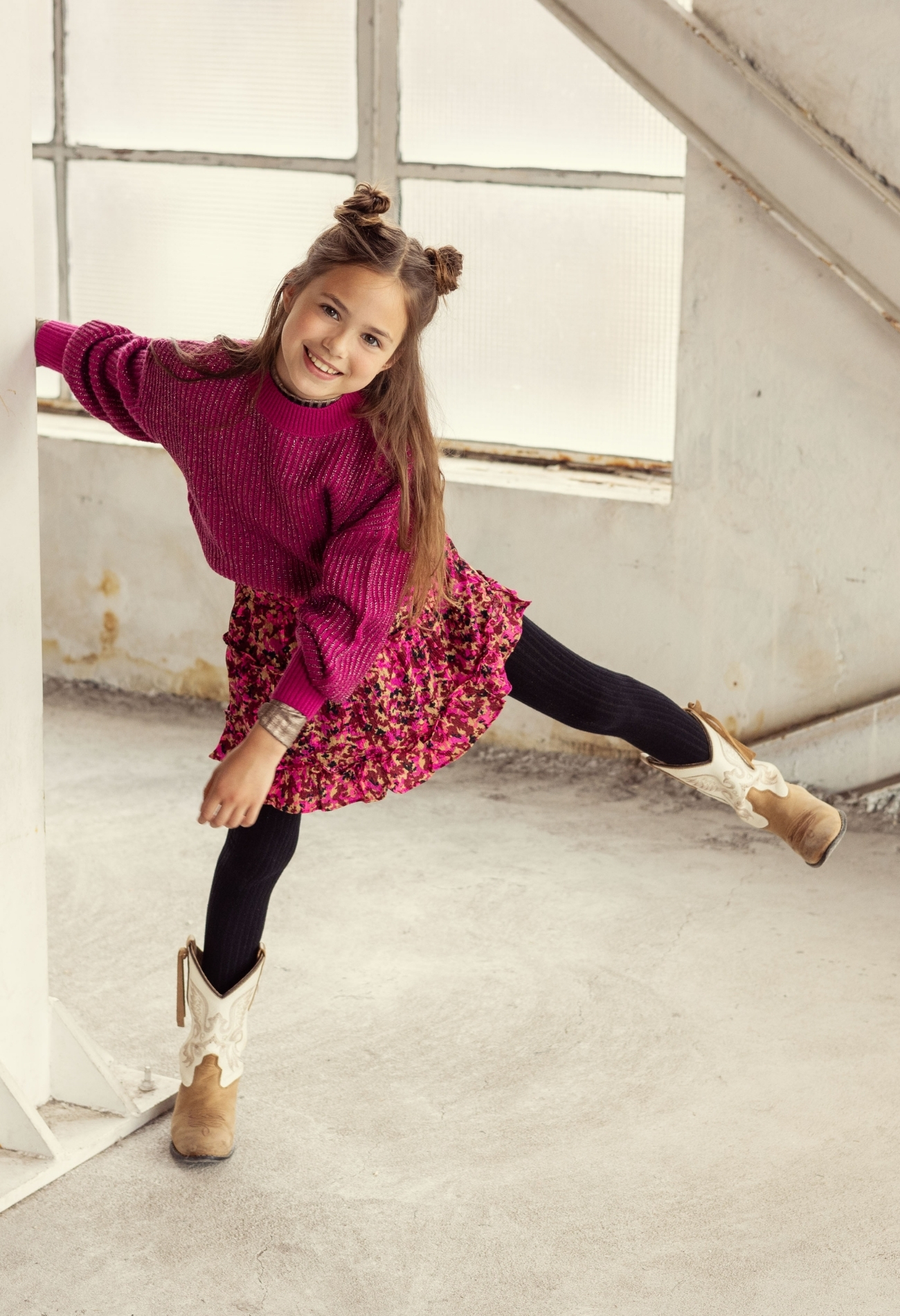 Deze rib gebreide trui rekt lekker met je mee en is een kort cropped en wijd model. De trui glimt en glinsterd door de lurex draad die door het garen is verweven. Echt net even anders dus!