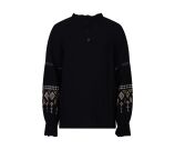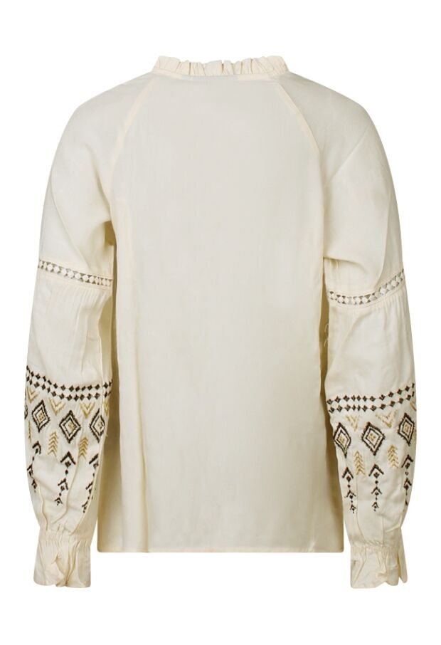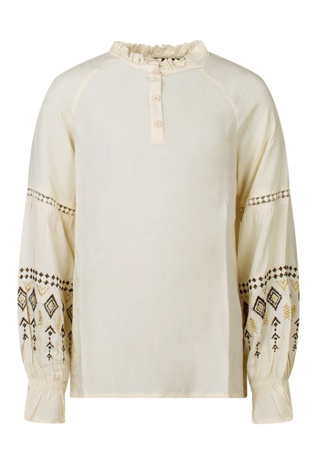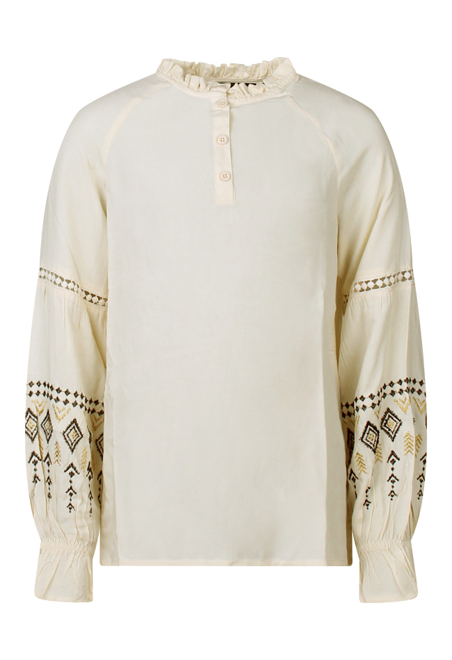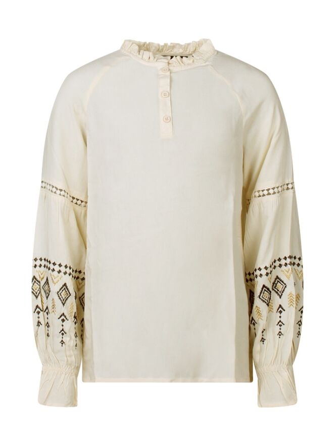 Mooie top van D-Zine met een Bohemian twist. Deze top heeft ruche rond de hals en knoopjes achter op de hals. De mouwen hebben een zeer fraai borduursel en een ingezette lace tape. Style deze Boho top af met een bijpassende gilet van bijvoorbeeld, suede of teddy en je komt helemaal trendy voor de dag!