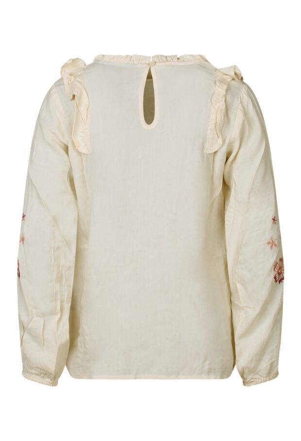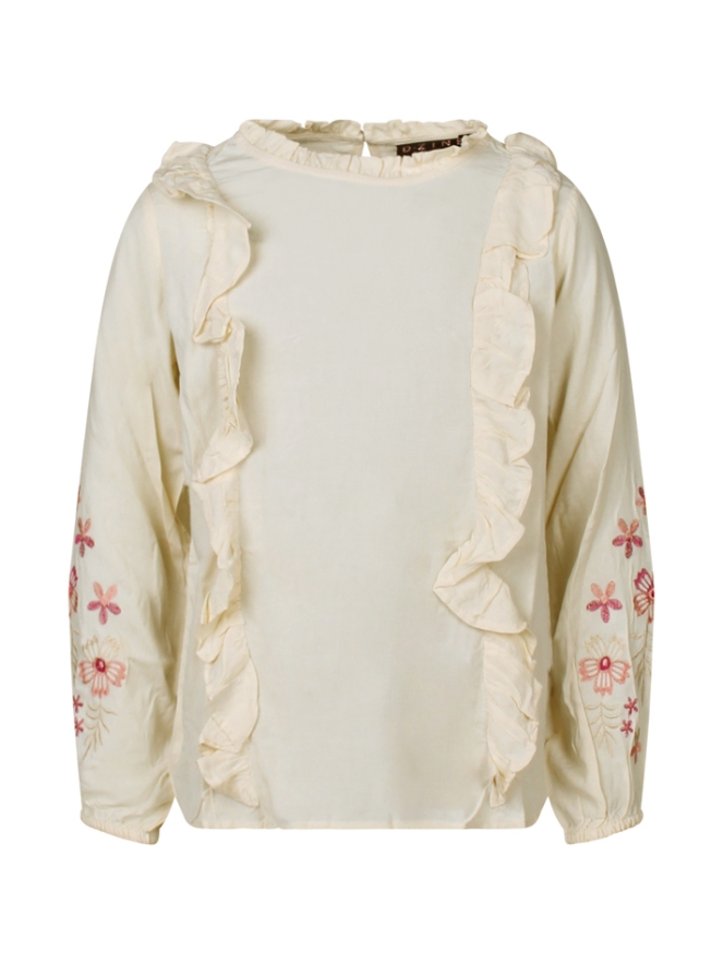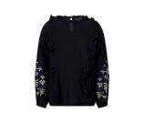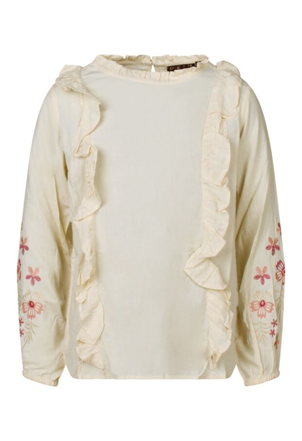Meisjes top met mooie bloemen bordurin op de mouwen. Ook heeft deze top ruches rond de hals en over de schouder helemaal naar beneden. Met op de rug nog een kleine druppel uitsparing met een knoopje. Deze top is niet warm, doe er daarom een laagje onder en kleed het af met een leuke bont of teddy gilet.