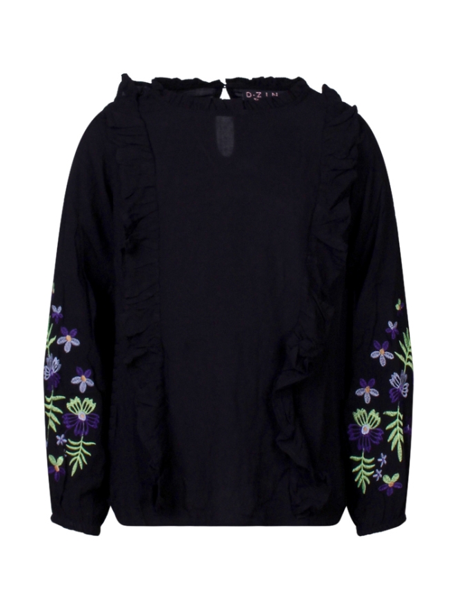 Meisjes top met mooie bloemen bordurin op de mouwen. Ook heeft deze top ruches rond de hals en over de schouder helemaal naar beneden. Met op de rug nog een kleine druppel uitsparing met een knoopje. Deze top is niet warm, doe er daarom een laagje onder en kleed het af met een leuke bont of teddy gilet.