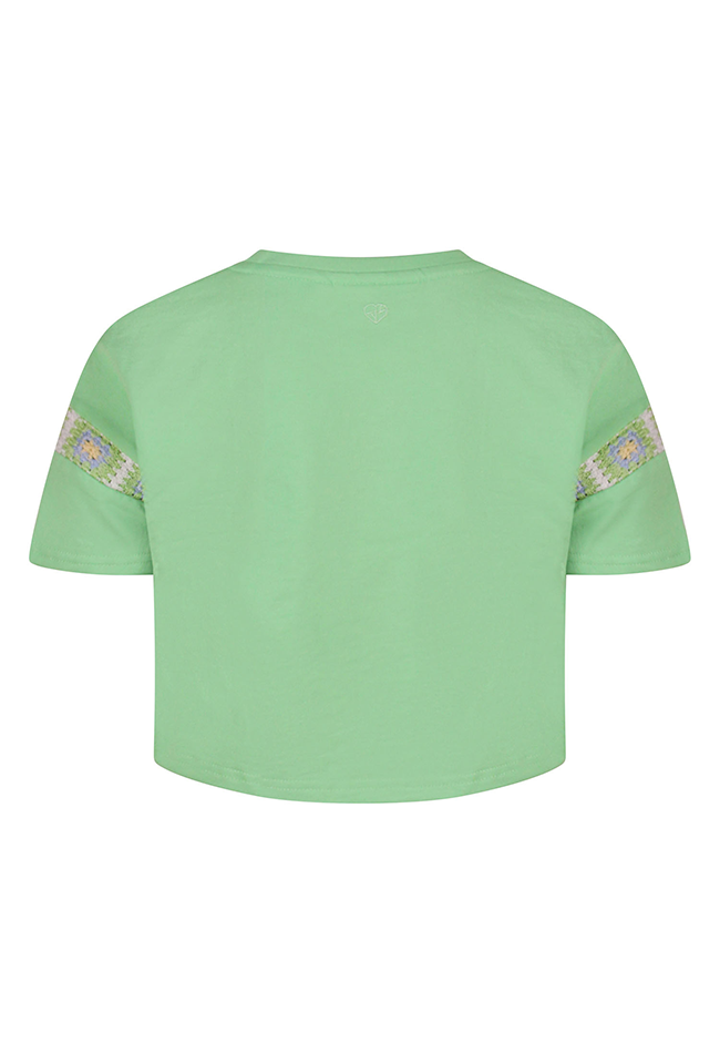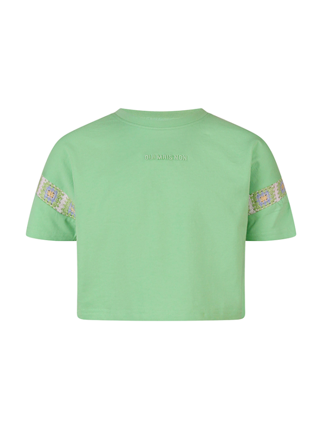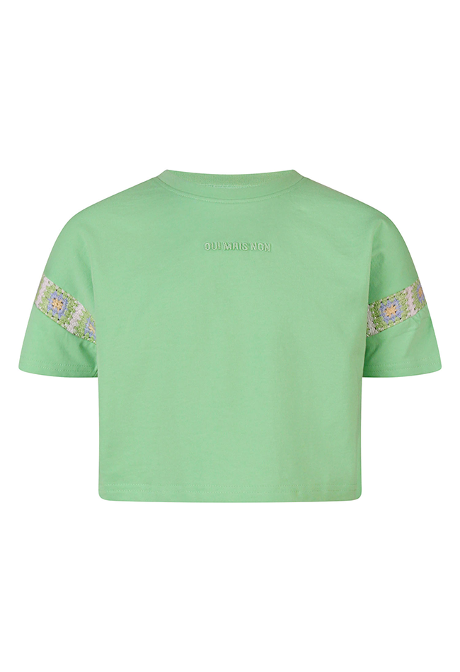 Deze trendy meisjescropped top van D-zine combineert comfort met speelse details. Gemaakt van een zachte sweatstof voelt de top comfortabel aan en heeft een wijdvallende pasvorm die perfect is voor een casual, relaxte look. De top heeft een ronde hals en korte mouwen, met een subtiele crochette geborduurde rand bij de mouwen voor een charmante finishing touch. Op het shirt staat in kleine letters de tekst 'oui mais non', wat een stijlvolle en speelse accent toevoegt.