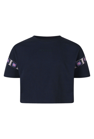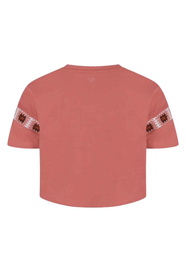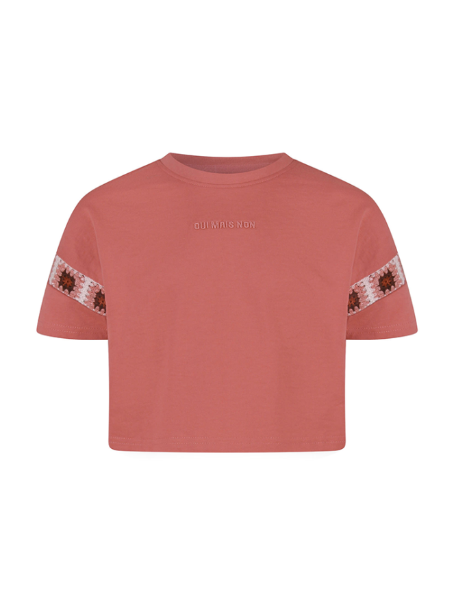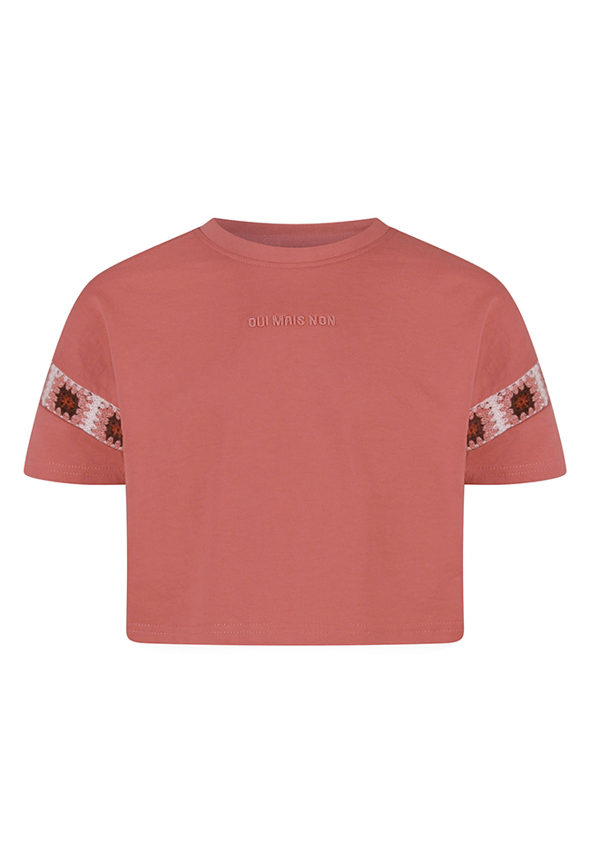 Deze trendy meisjescropped top van D-zine combineert comfort met speelse details. Gemaakt van een zachte sweatstof voelt de top comfortabel aan en heeft een wijdvallende pasvorm die perfect is voor een casual, relaxte look. De top heeft een ronde hals en korte mouwen, met een subtiele crochette geborduurde rand bij de mouwen voor een charmante finishing touch. Op het shirt staat in kleine letters de tekst 'oui mais non', wat een stijlvolle en speelse accent toevoegt.