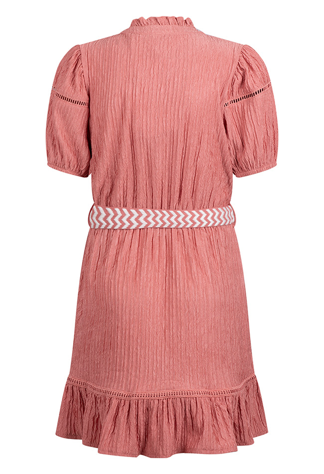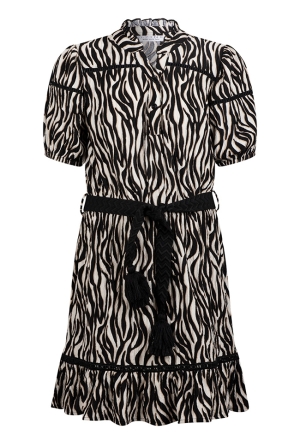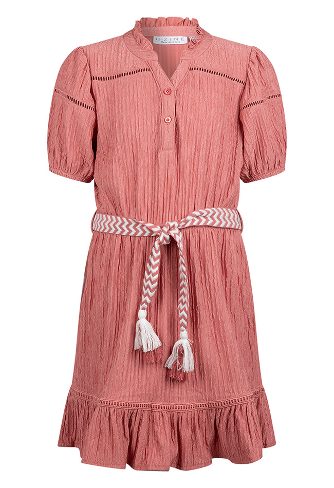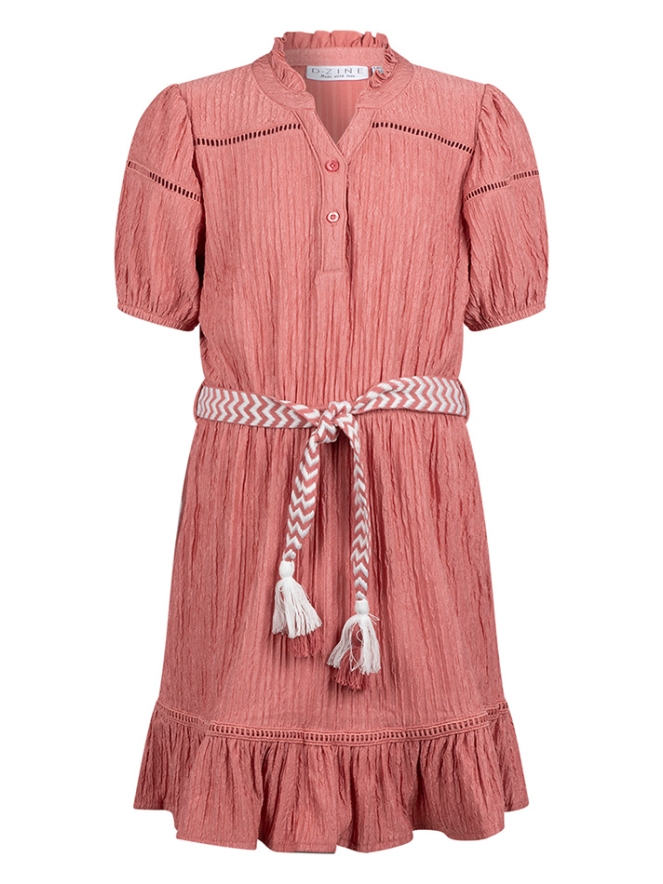 Dit trendy meisjes jurkje van D-zine is perfect voor zowel alledaagse momenten als feestelijke gelegenheden. De jurk is gemaakt van een comfortabele crinkle stof en afgewerkt met speelse lace tape details, wat zorgt voor een vrolijke en modieuze uitstraling. De V-hals en korte pofmouwen geven het jurkje een luchtige look, terwijl het bijpassende riempje zorgt voor een mooie pasvorm die eenvoudig aangepast kan worden. De jurk is verkrijgbaar in verschillende varianten: een opvallende zebra print en effen kleuren zoals army, oud roze en paars. Zo is er voor ieder meisje een favoriete stijl te kiezen.