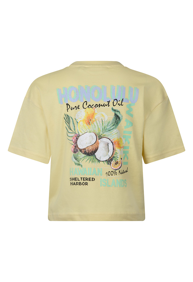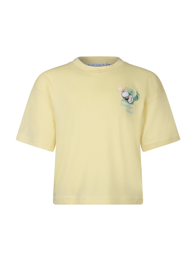 Breng een tropische vibe in de garderobe van je meisje met dit kleurrijke T-shirt van D-zine. Gemaakt van 100% katoen voelt het shirt zacht en comfortabel aan, ideaal voor dagelijks gebruik en zomerse avonturen. Het heeft een boxy fit voor een stoere, relaxte look en korte mouwen die perfect zijn voor warme dagen. Op de voorkant van het shirt staan twee kokosnoten met een blad en de tekst ?Hawaiian Islands?, terwijl de achterkant een grote tropische print heeft met kokosnoten, passievruchten, bloemen en bladeren, met daarop de namen Honolulu, Waikiki en Hawaiian Islands. Het T-shirt combineert comfort met een opvallende, speelse stijl die perfect past bij de zomer.