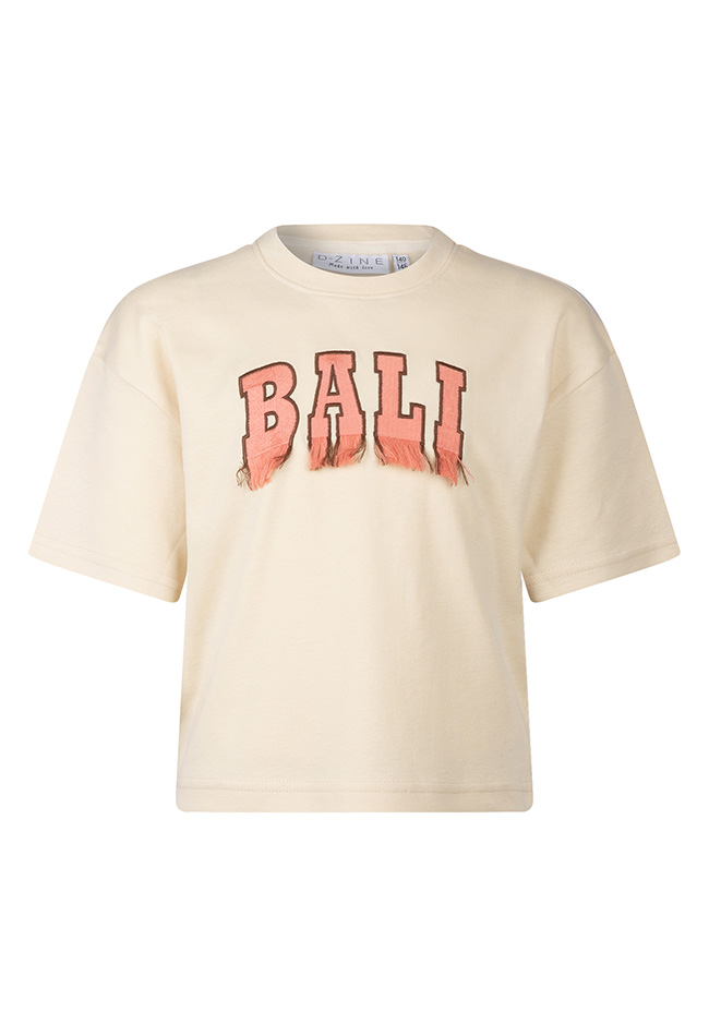 Trendy T-shirt in een boxy fit. Boxy is in zijn geheel wat wijder, dus hou je ervan dat het allemaal wat losser zit dan is dit hét T-shirt voor jou! Met Bali borduring met onder de letters een afgewerkte rafelrand voor een speelse look!