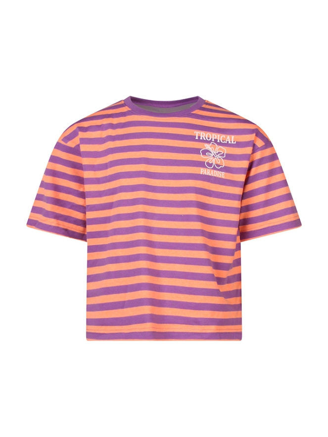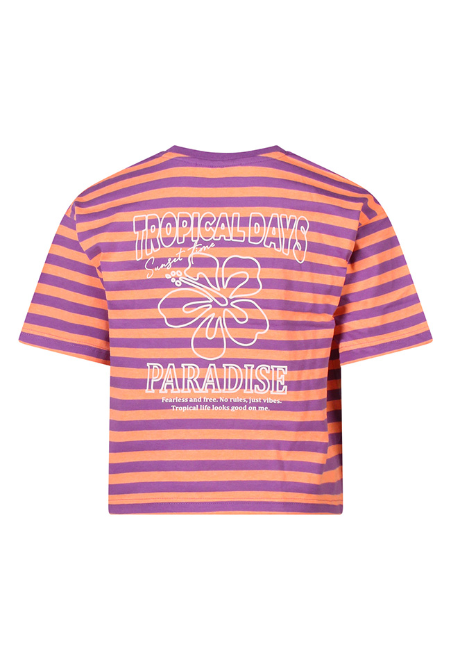 Dit gestreepte T-shirt voor meisjes is perfect voor een frisse, zomerse look. Het shirt combineert een modern streeppatroon met een vrolijke ?tropical paradise? print op zowel de voor- als achterkant, waardoor het een echte eyecatcher is. Gemaakt van zachte, ademende stof zit het T-shirt comfortabel, ideaal voor actieve meisjes die houden van bewegen en spelen. De trendy stijl en speelse print maken het een must-have voor warme dagen en zomerse avonturen.