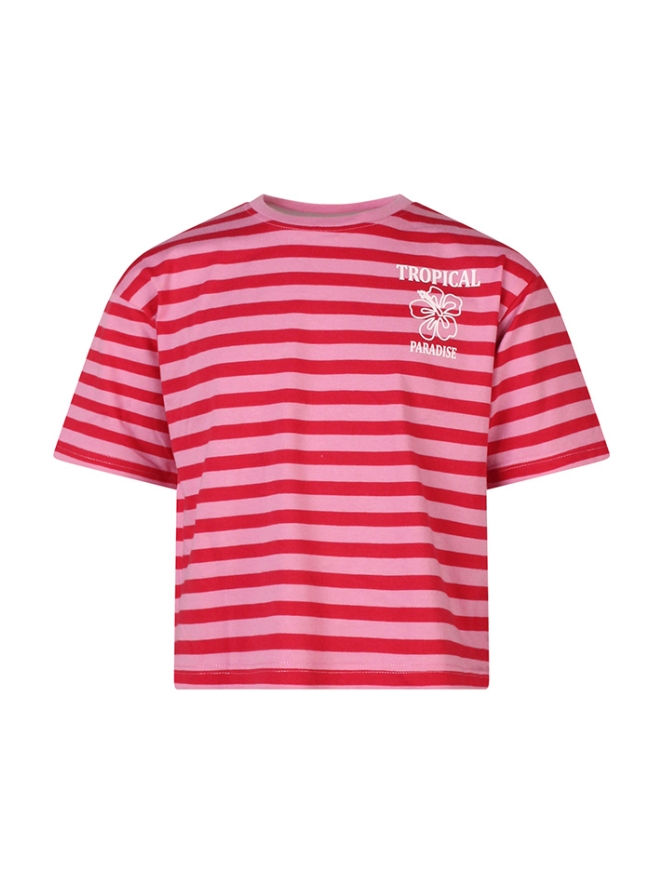 Dit gestreepte T-shirt voor meisjes is perfect voor een frisse, zomerse look. Het shirt combineert een modern streeppatroon met een vrolijke ?tropical paradise? print op zowel de voor- als achterkant, waardoor het een echte eyecatcher is. Gemaakt van zachte, ademende stof zit het T-shirt comfortabel, ideaal voor actieve meisjes die houden van bewegen en spelen. De trendy stijl en speelse print maken het een must-have voor warme dagen en zomerse avonturen.