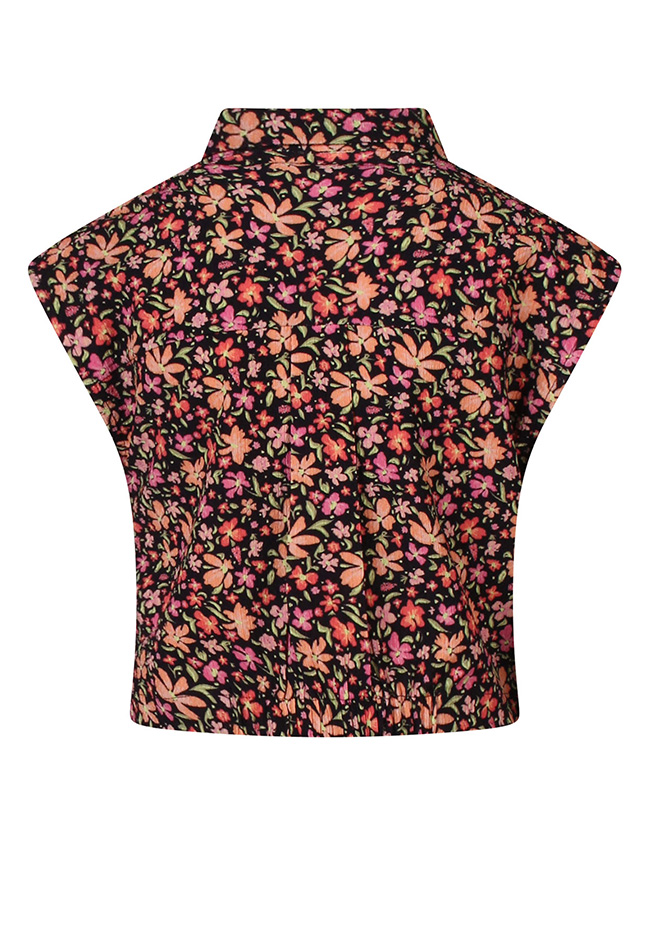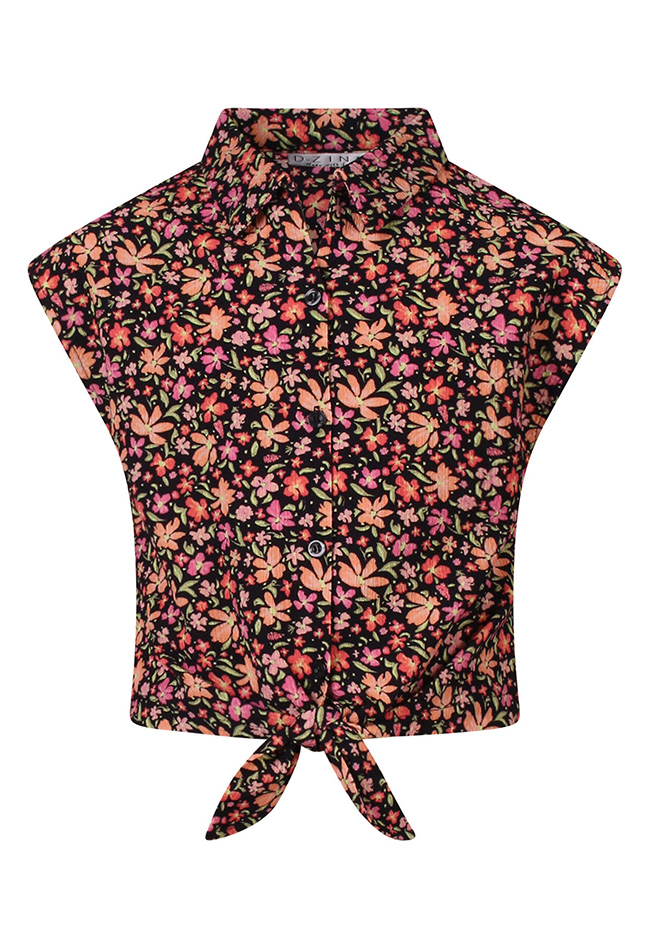 Breng een speelse en stijlvolle touch aan de garderobe van je dochter met de D-zine meisjes blouse. Deze mouwloze blouse voelt licht en comfortabel aan. De klassieke kraag en het geknoopte detail onderaan geven een trendy, modieuze uitstraling. Het blouseje heeft een regular fit en een cropped lengte, perfect om te combineren met een mooie jeans, shorts of het bijpassende broekrokje (Z10329) voor een complete, coole look. Het opvallende dessin maakt het blouseje een echte eyecatcher.