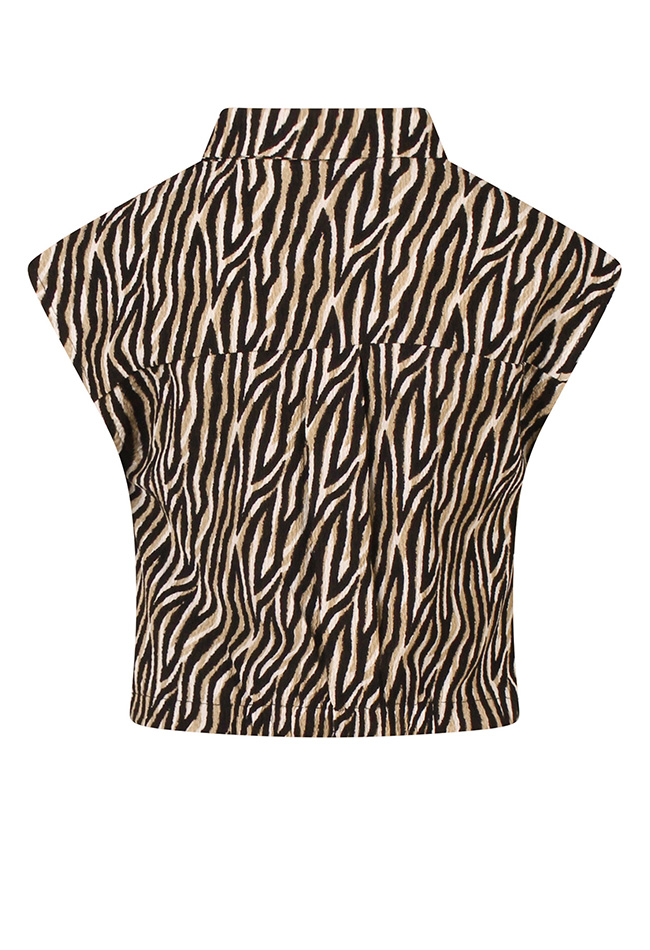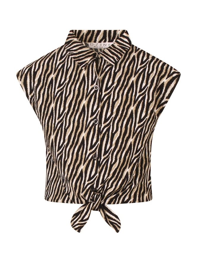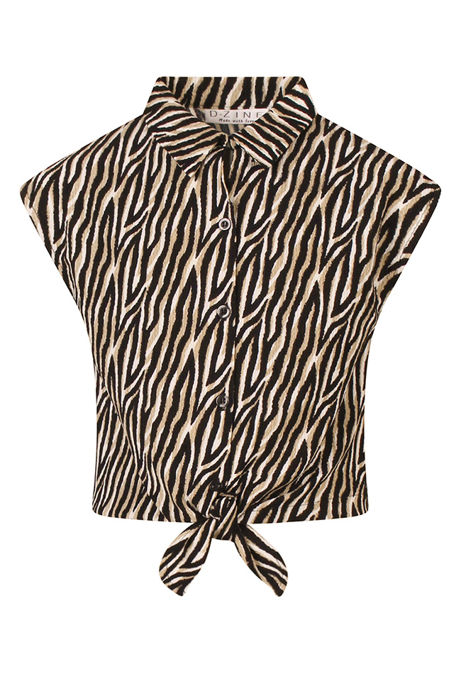 Breng een speelse en stijlvolle touch aan de garderobe van je dochter met de D-zine meisjes blouse. Deze mouwloze blouse voelt licht en comfortabel aan. De klassieke kraag en het geknoopte detail onderaan geven een trendy, modieuze uitstraling. Het blouseje heeft een regular fit en een cropped lengte, perfect om te combineren met een mooie jeans, shorts of het bijpassende broekrokje (Z10329) voor een complete, coole look. Het opvallende dessin maakt het blouseje een echte eyecatcher.