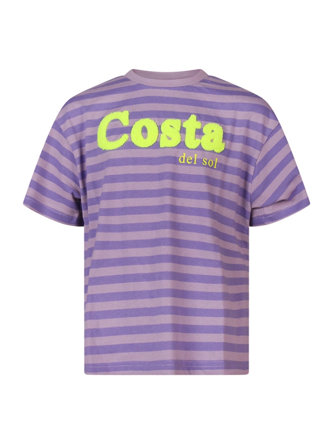 Laat je outfit stralen met dit trendy meisjes T-shirt in frisse zomerstijl! Het shirt is uitgevoerd in een speelse streep en afgewerkt met een opvallende neon frottee applicatie met de tekst Costa del Sol. Dit geeft het T-shirt een vrolijke, zonnige uitstraling die perfect past bij warme dagen en casual looks.
