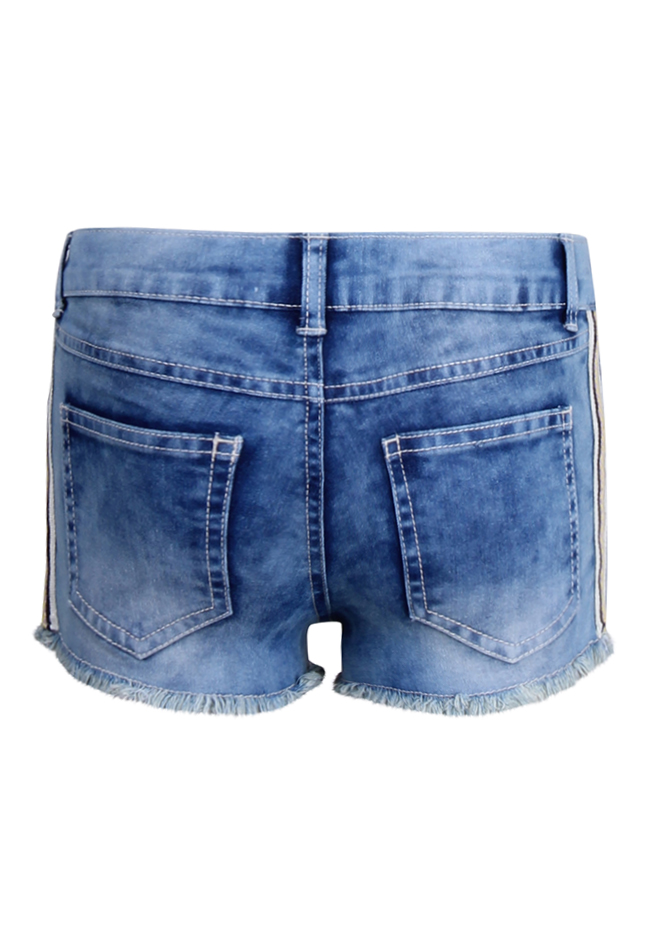 Denim short van D-zine. De shorts zijn van comfortabele denim en er zit veel stretch in. Aan de zijkanten zit een gestreept stukje stof en de pijpen zijn gerafeld afgewerkt. Materiaal: 73% katoen, 25% polyester, 2% elasthan