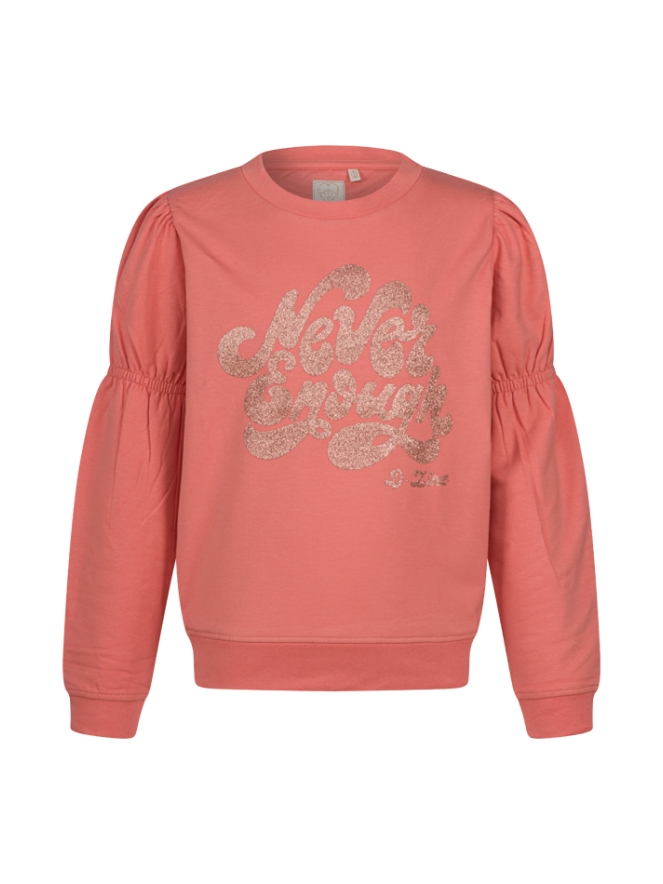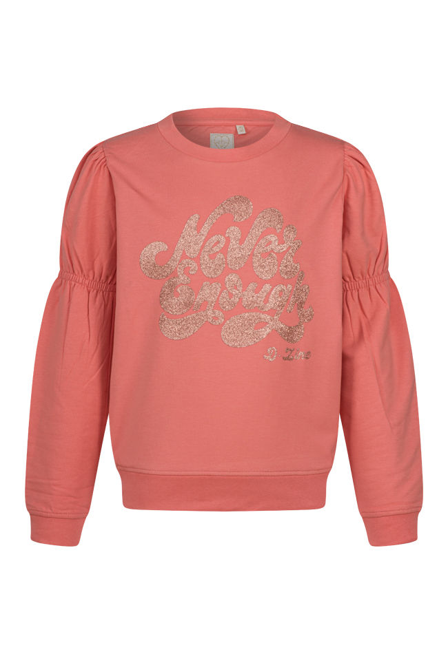Trui van D-zine. De trui heeft een glitter tekst op de voorkant. Er zit elastiek in de mouw waardoor er een pofmouw ontstaat. Materiaal: 95% katoen, 5% lycra. 30 graden wassen, niet bleken, niet in de droger, lauw strijken.