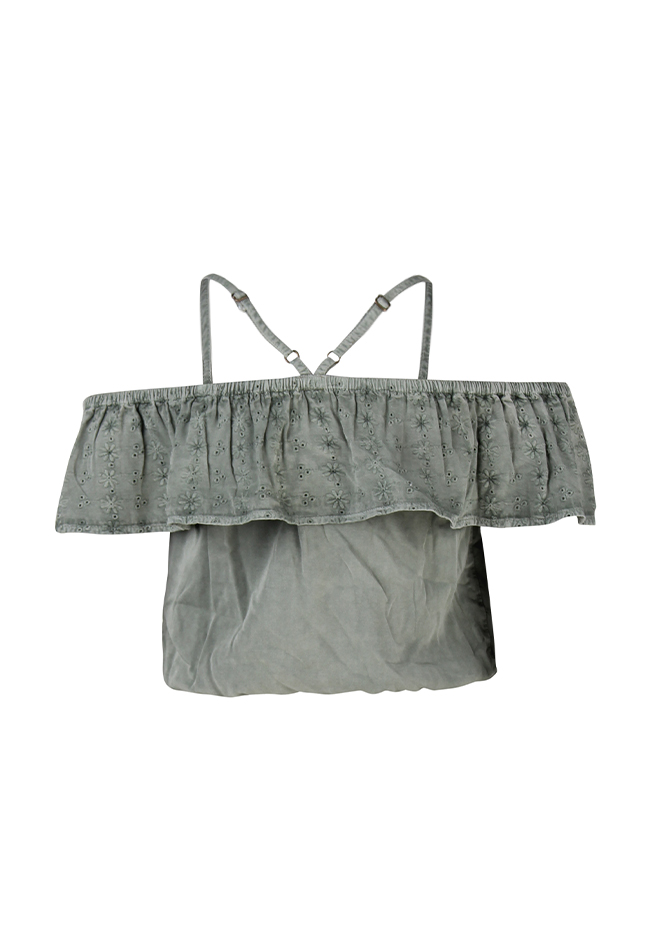 Off the schouder blouse van D-zine. De blouse heeft een broderie ruche band. De blouse heeft spaghetti bandjes en aan de onderkant elastiek. Materiaal: 100% viscose. wassen op 30 graden, niet bleken, niet in de droger, kan gestreken worden.