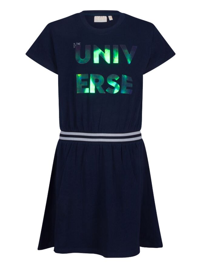 Jurk van D-zine. De jurk heeft een elastieken taille band, een uitlopend skater rokje en een holografische tekst op de voorkant. Materiaal: 95% katoen, 5% lycra. Wassen op 30 graden, niet bleken, niet in de droger, kan gestreken worden.