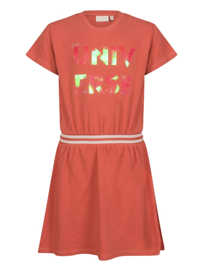 Jurk van D-zine. De jurk heeft een elastieken taille band, een uitlopend skater rokje en een holografische tekst op de voorkant. Materiaal: 95% katoen, 5% lycra. Wassen op 30 graden, niet bleken, niet in de droger, kan gestreken worden.