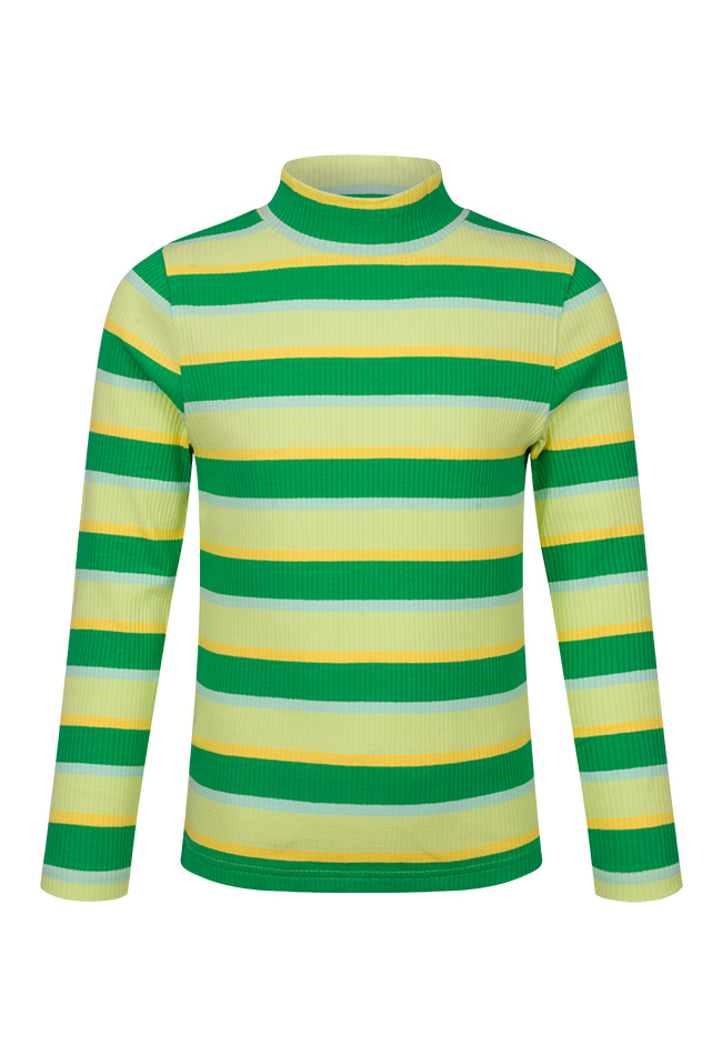 T-shirt met een gestreept patroon met vier verschillende kleuren en heeft een hoge boord bij de hals. Het shirt is aansluitend en aansluitende lange mouwen en is verkrijgbaar in drie verschillende kleuren.