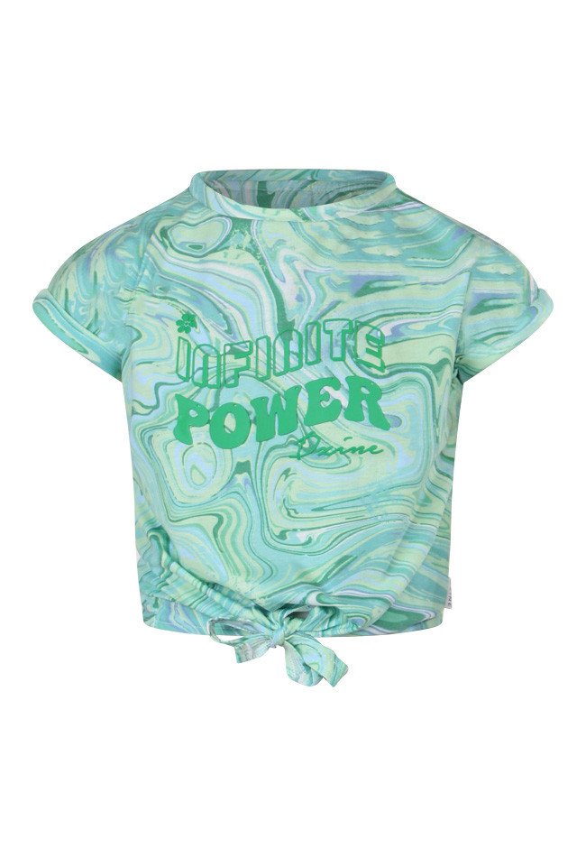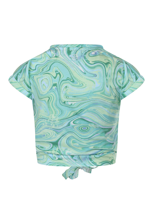 Dit t-shirt met marble print heeft korte omslag mouwen en een ronde hals. Aan de voorkant zit een tekst opdruk en een strik detail. Maak een set met het bijpassende short (Z70053) en/of cropped sweater (Z0051)