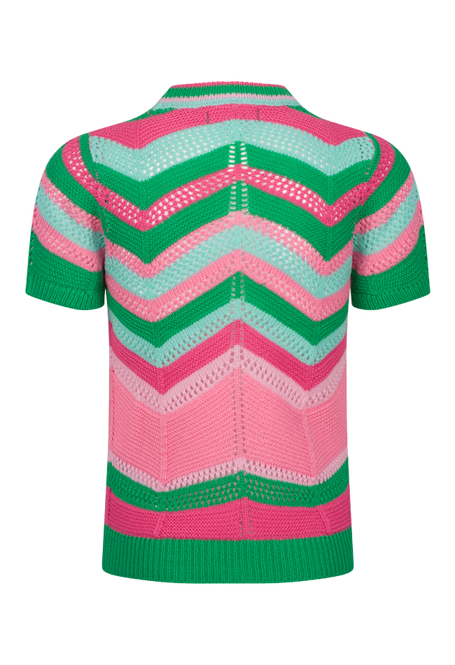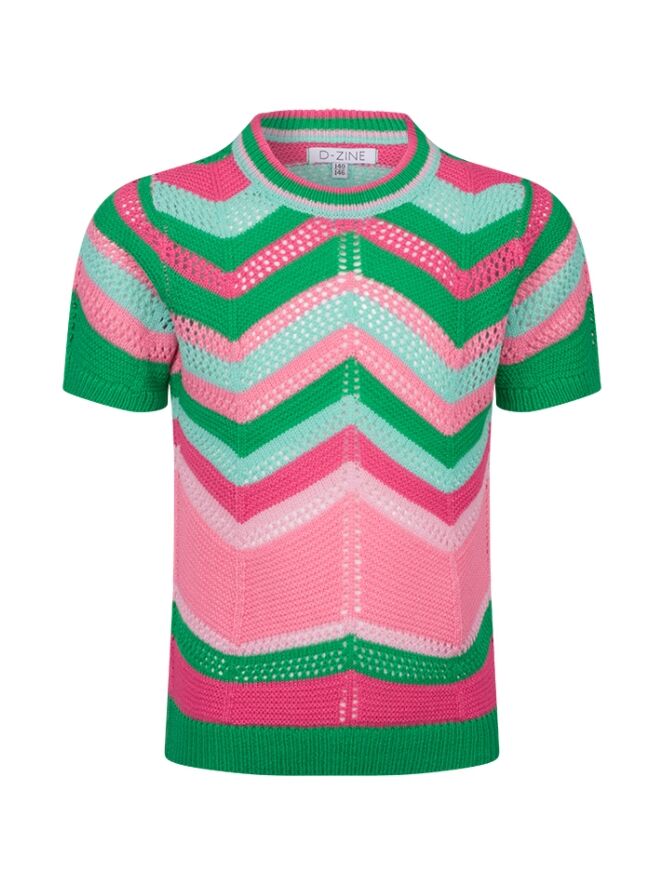 Dit t-shirt is Ajour gebreid waardoor hij een opengewerkt gaatjesmotief krijgt. Daarnaast heeft hij een meerkleurig gestreept/golvend patroon in zomerse fel en pastel kleuren. Het t-shirt heeft een ronde hals, korte mouwen en valt regular. Combineer deze knitwear met een jeans of leatherlook rokje voor een stoere uitstraling.