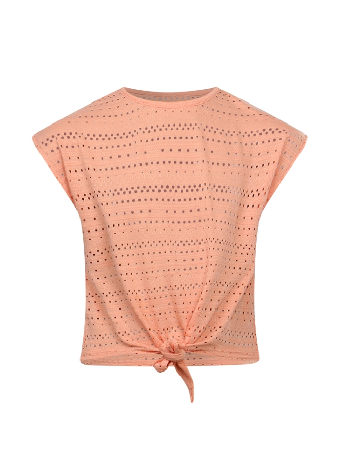 Ajour gebreid t-shirt met een aangeknipte mouw en een knoopdetail aan de voorkant.