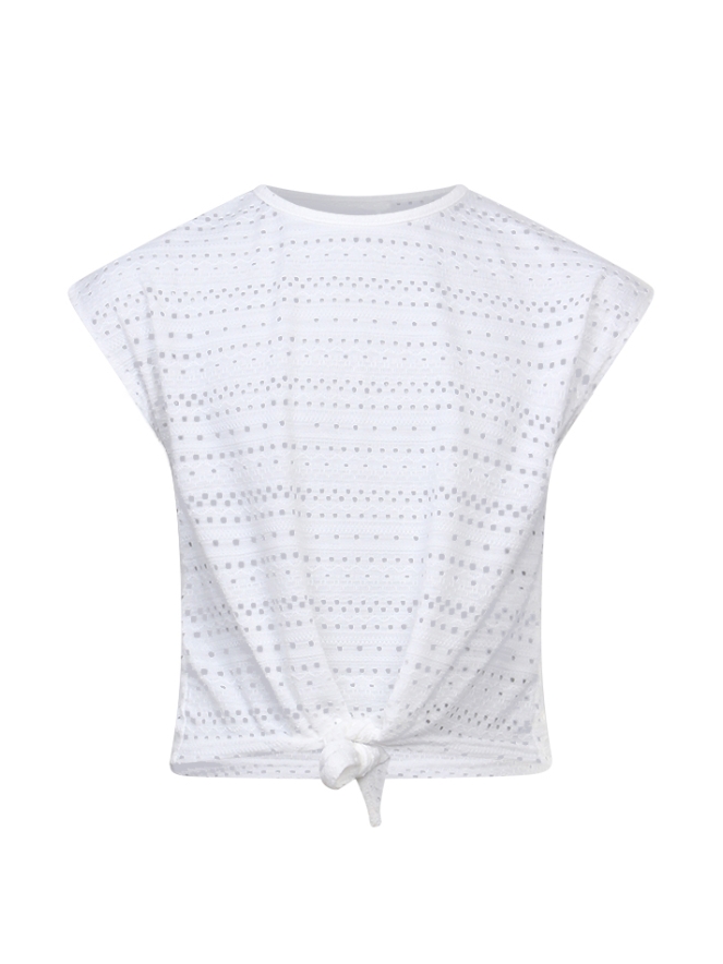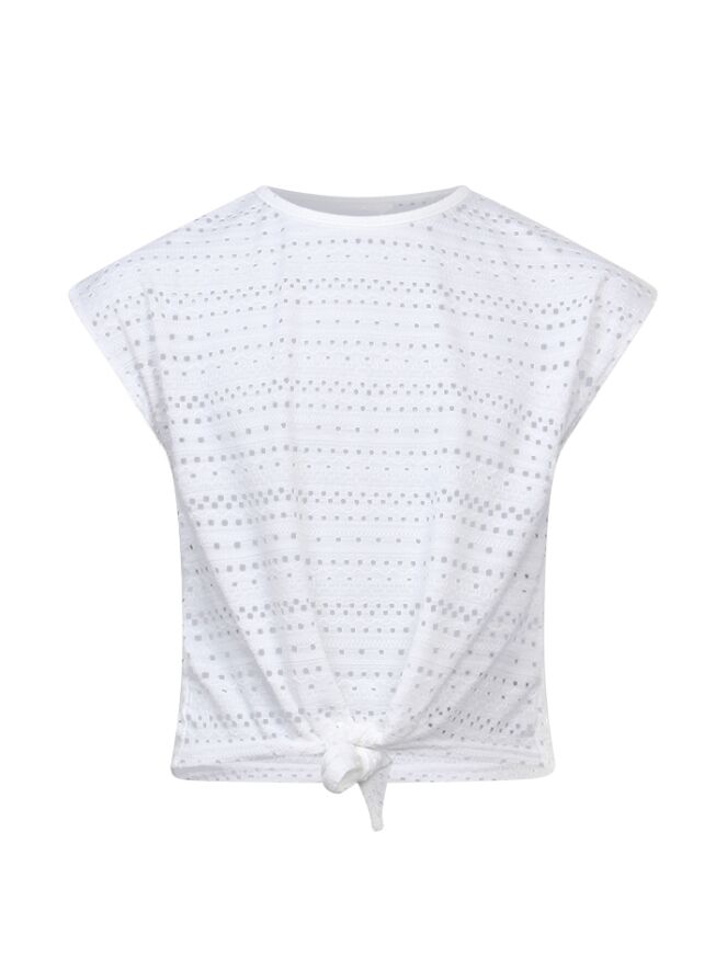 Ajour gebreid t-shirt met een aangeknipte mouw en een knoopdetail aan de voorkant.