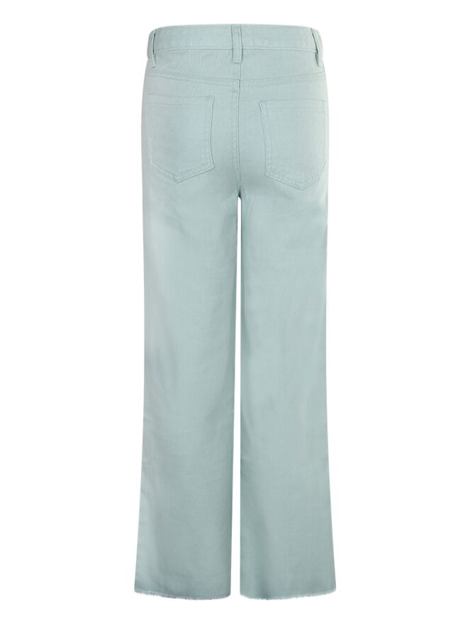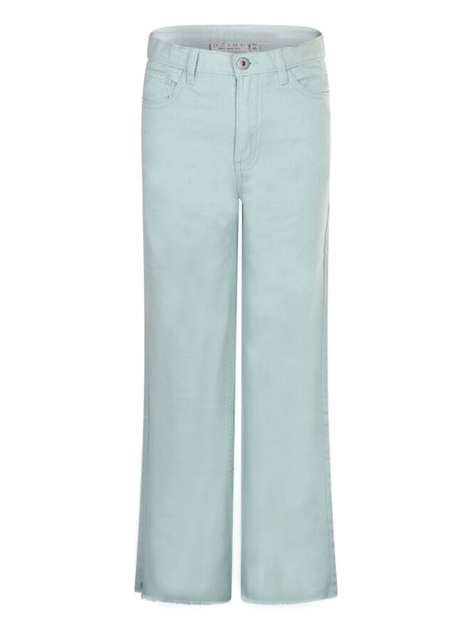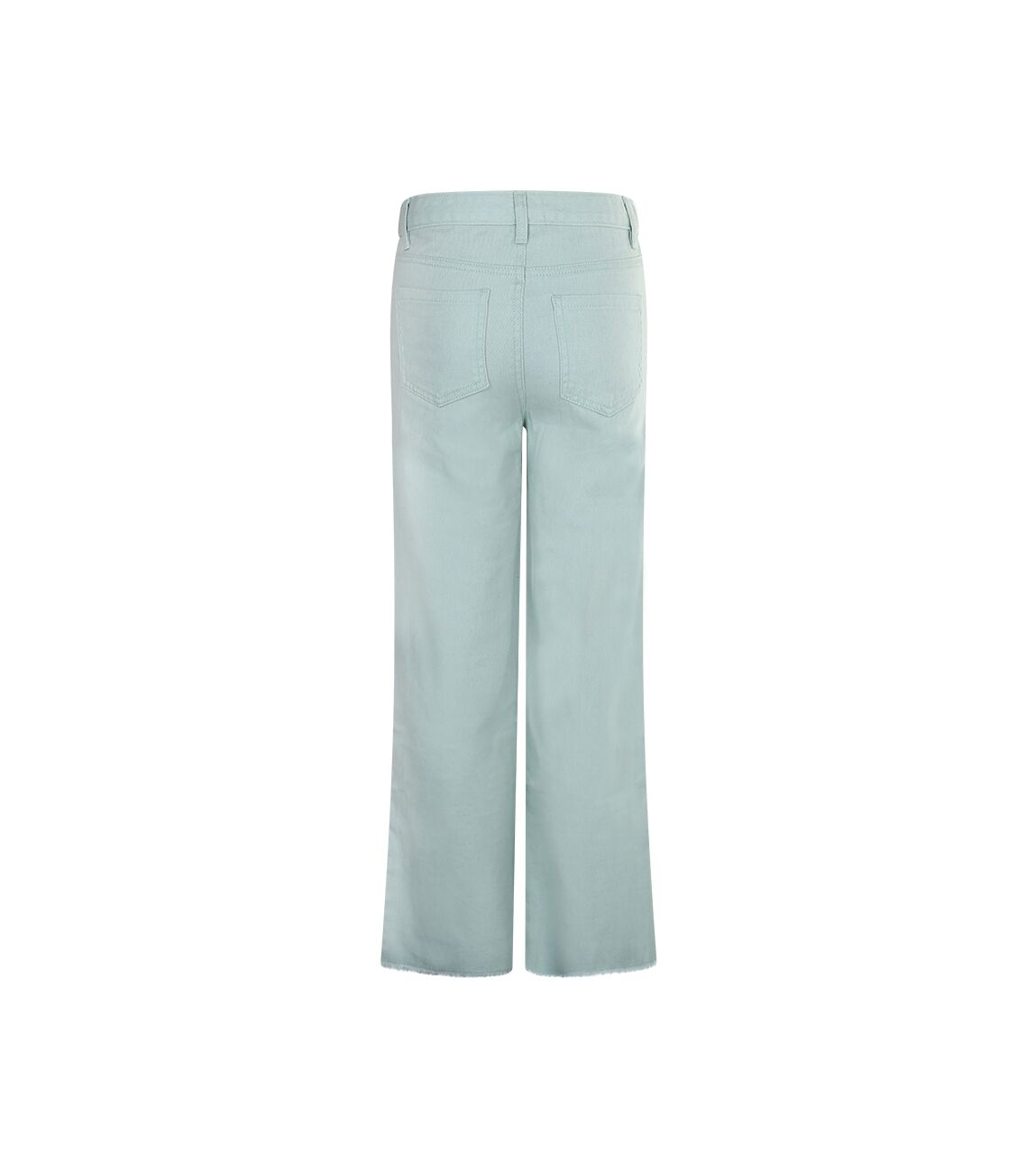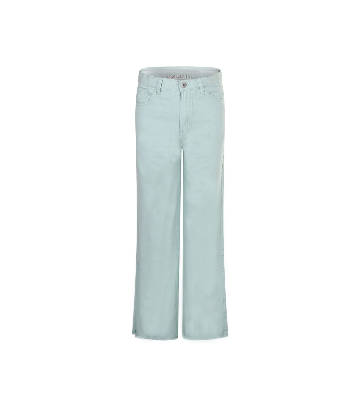 Deze five pocket jeans heeft een rits en een schuifknoop. De jeans heeft een hoge taille aan de binnenkant zit een elastiek om de taille strakker te maken. De jeans heeft rechte wijde pijpen met aan de onderkant een raw edge en is verkrijgbaar in twee kleuren.