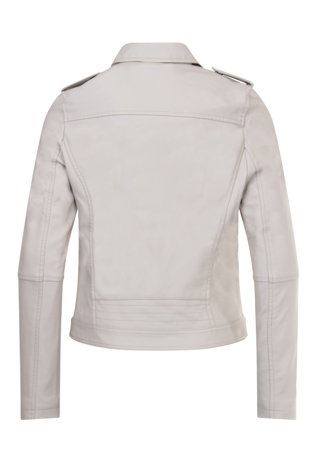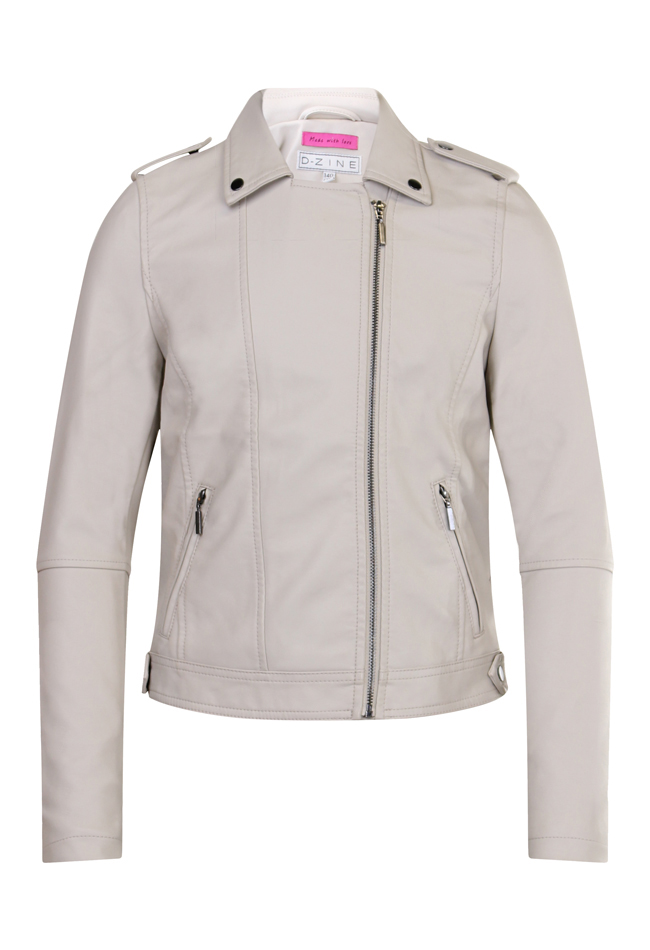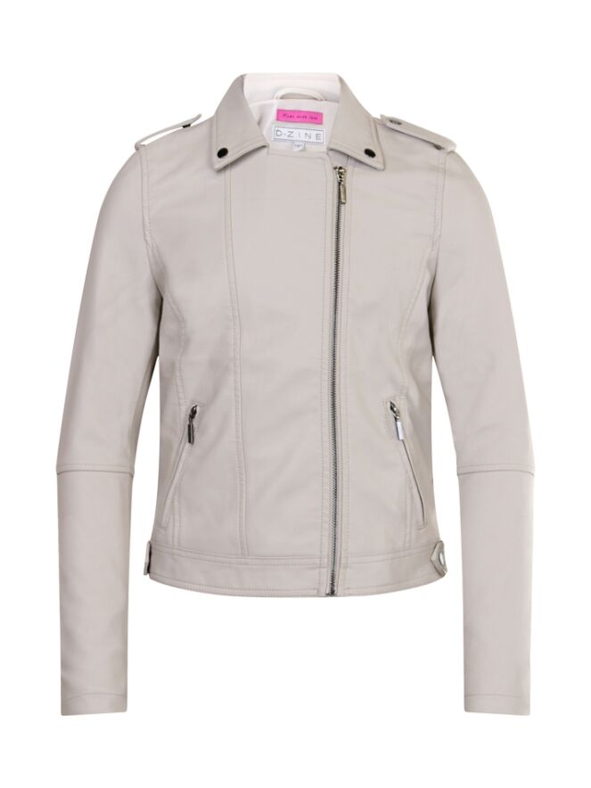 Dit stoere bikker jack in leerlook heeft een rits aan de voorkant. Voor zitten twee paspelzakken met rits. Er zitten detail drukknopen op de kraag en op de schouders. Je kan hem dragen als tussenjas maar ook combineren op een jeans en T-shirt voor een dagelijkse look. Hij is verkrijgbaar in drie verschillende kleuren.