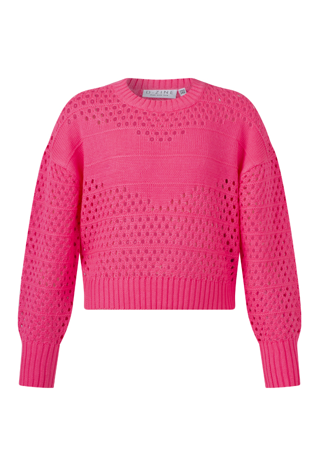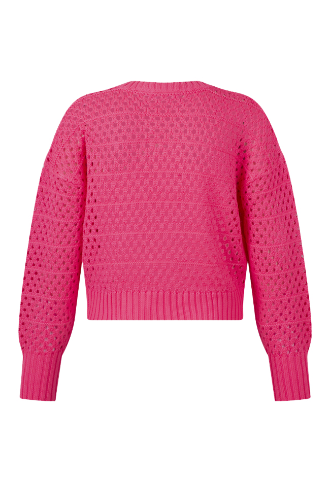 Deze meisjes trui is een korter model met ajourbreisel. Dit wil zeggen dat de trui het beste gedragen kan worden met een hemdje of shirtje eronder i.v.m. doorschijnende effect.