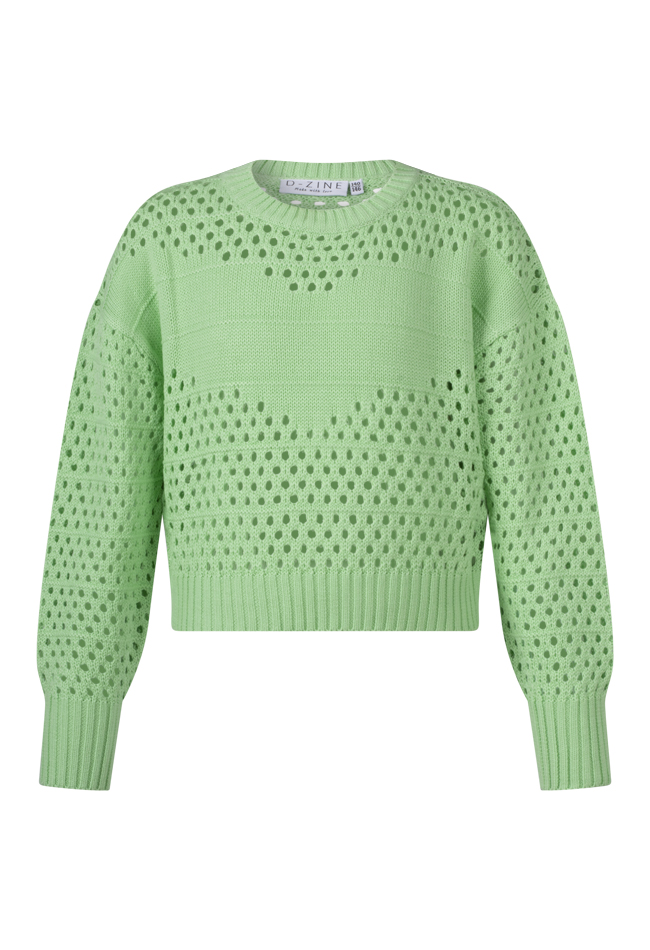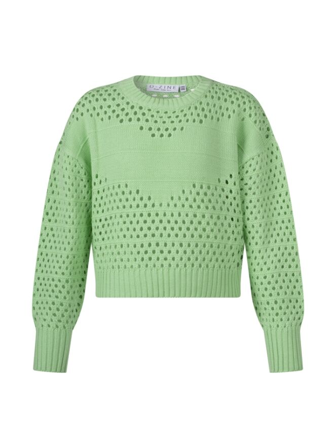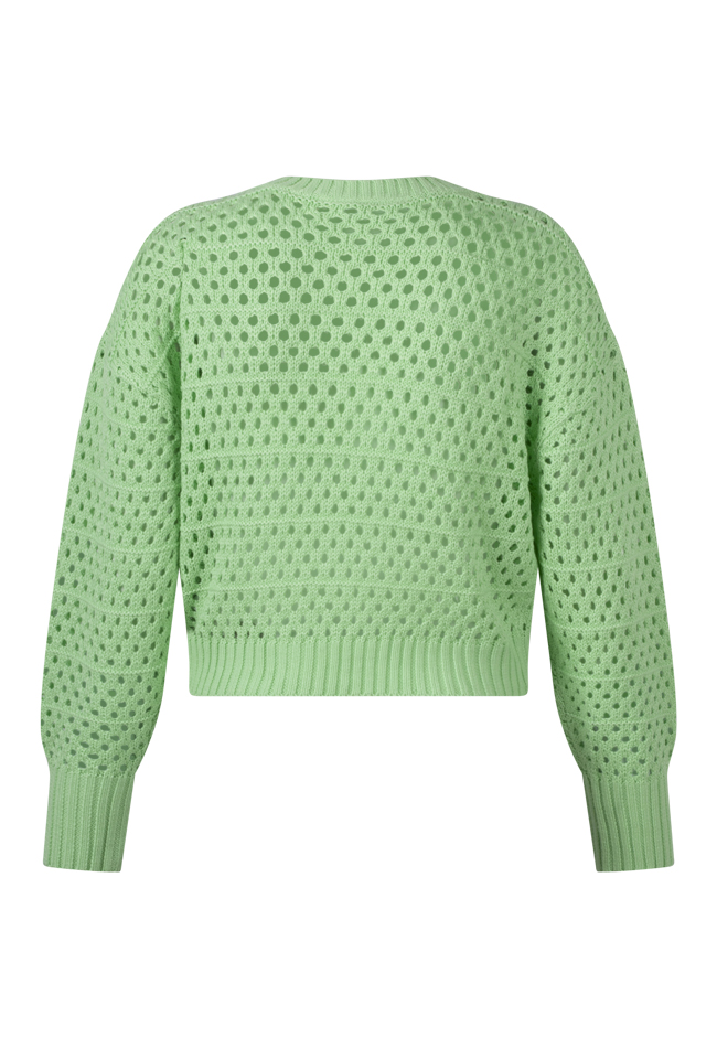 Deze meisjes trui is een korter model met ajourbreisel. Dit wil zeggen dat de trui het beste gedragen kan worden met een hemdje of shirtje eronder i.v.m. doorschijnende effect.