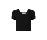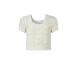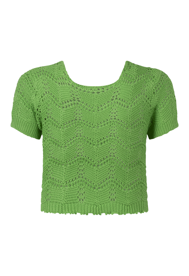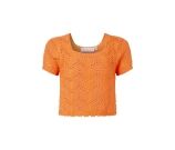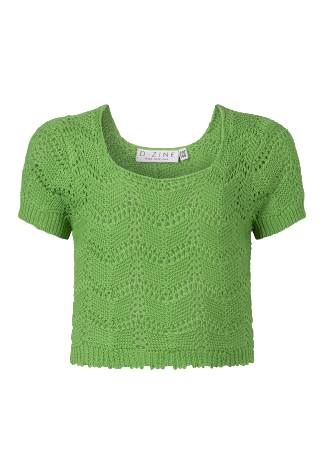Deze top met korte mouw heeft een opvallende hals en doorzichtig door het ajourbreisel.