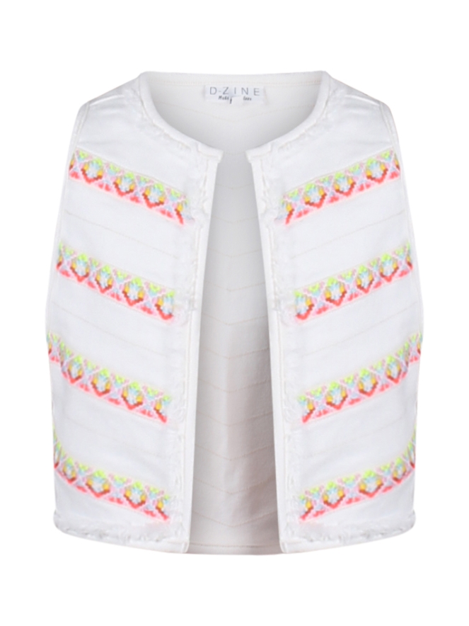 Dit giletje heeft leuke details en is afgewerkt met een gerafelde rand. Er is een denim short verkrijgbaar met de zelfde afwerking en details met Art. nr. Z80055
