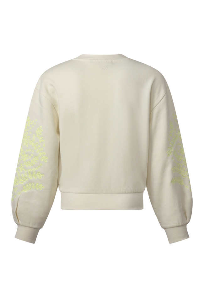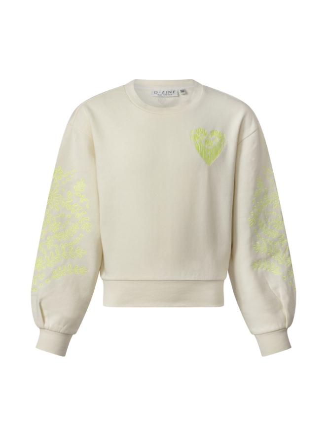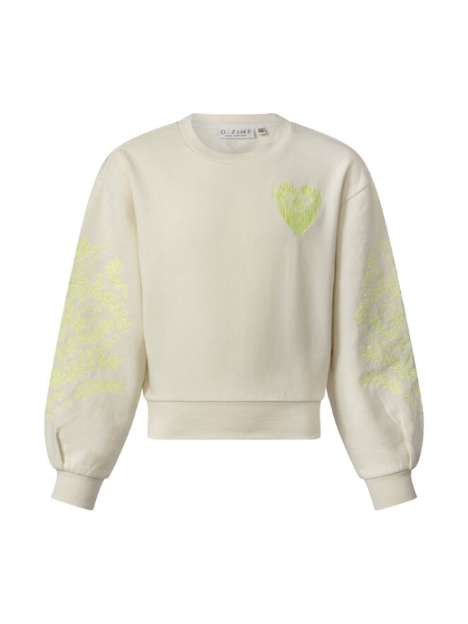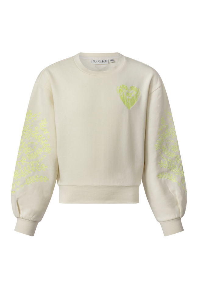 Deze sweater met ballon mouwen heeft een ajour bloem borduursel op beide mouwen. Op de borst staat, you are my sunshine in de vorm van een hartje. Dit is een ruimvallend model.