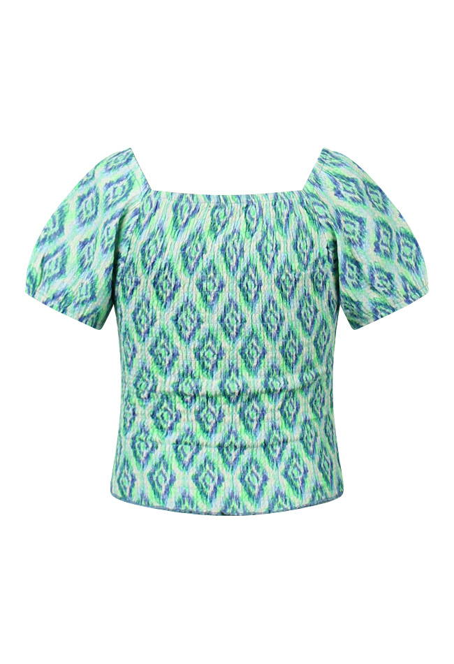 Deze top met korte mouwen heeft pofmouwen en een ikatdesign. In het zelfde patroon is er ook een rokje, broek, short en jurk verkrijgbaar. Art.nummers Rok Z80047 Broek Z80058 Short Z80060 Jurk Z80178